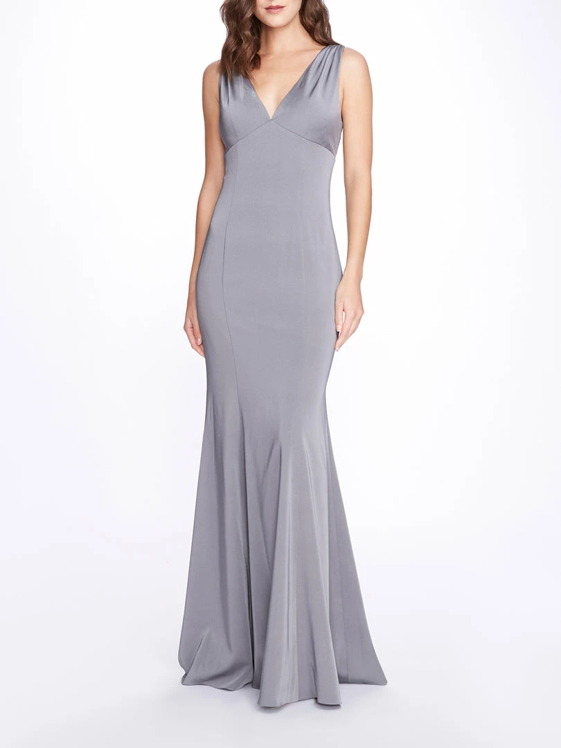 Enchanting V-neck gown featuring a high waist with a satin crepe stretch