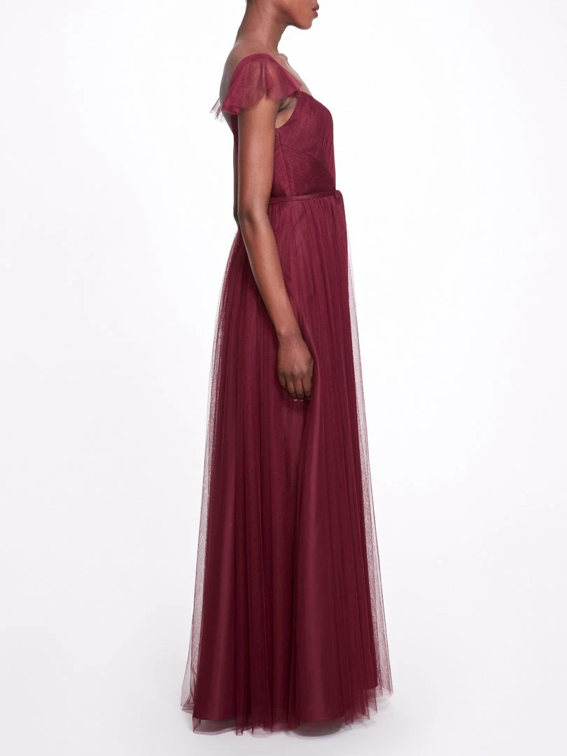The Frascati gown in scarlet red features a ruched u-neck and romantic ruffle sleeve.
