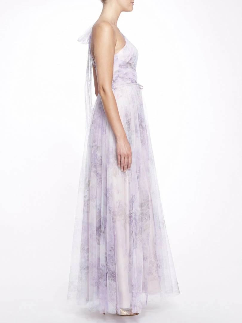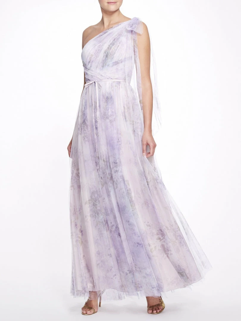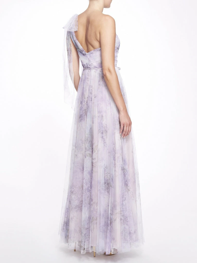 All eyes will be on you at your next event in the Ivrea gown. Featuring dreamy watercolor printed tulle, a fairytale one-shoulder, and a delightful bow cinching the waist.