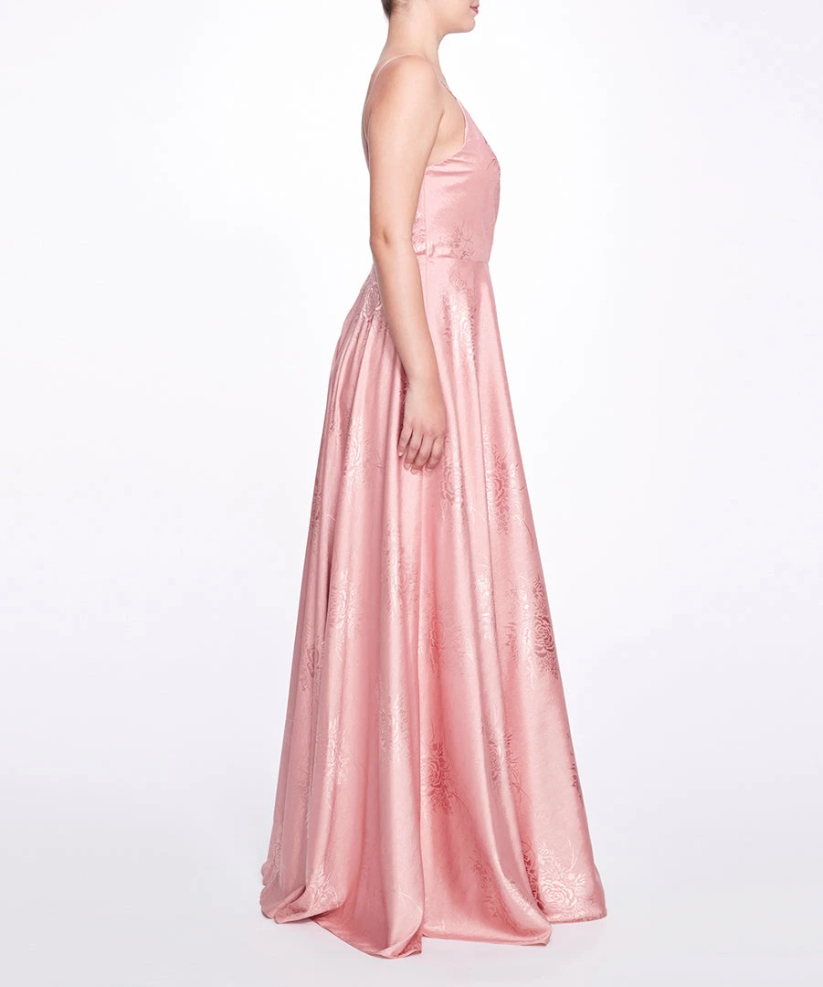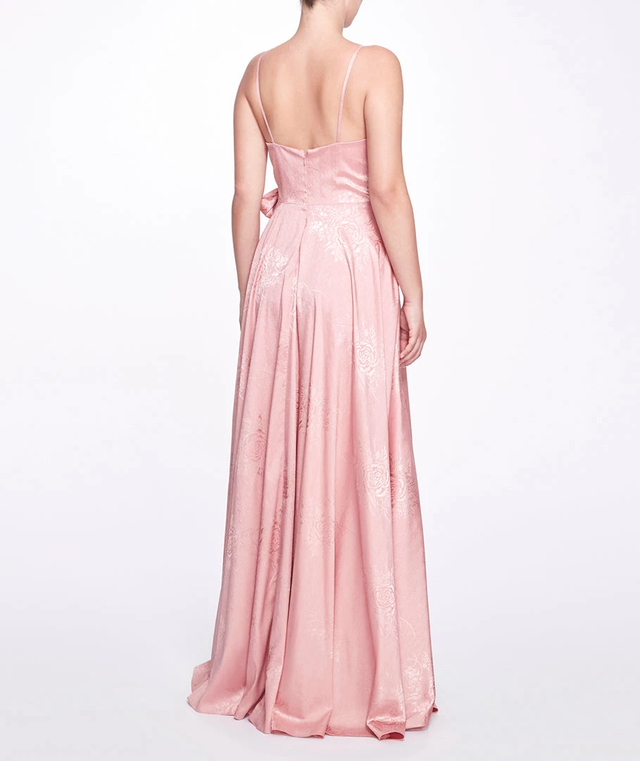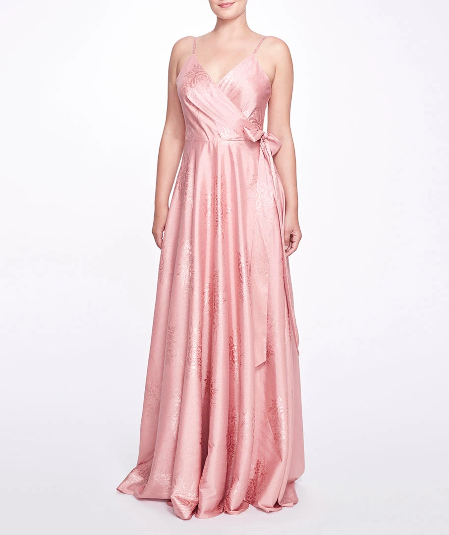 All eyes will be on you at your next event in this Matera gown. Featuring a wrap neckline and the hidden floral pattern.Â