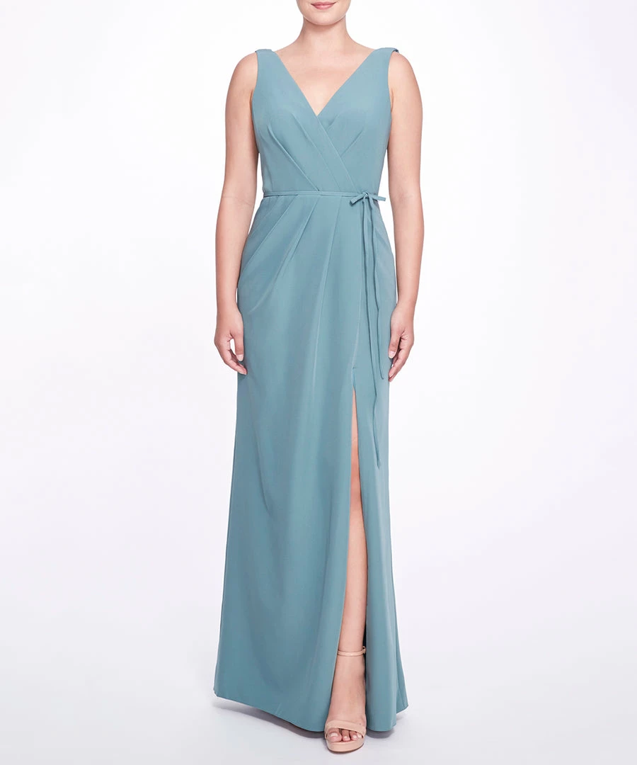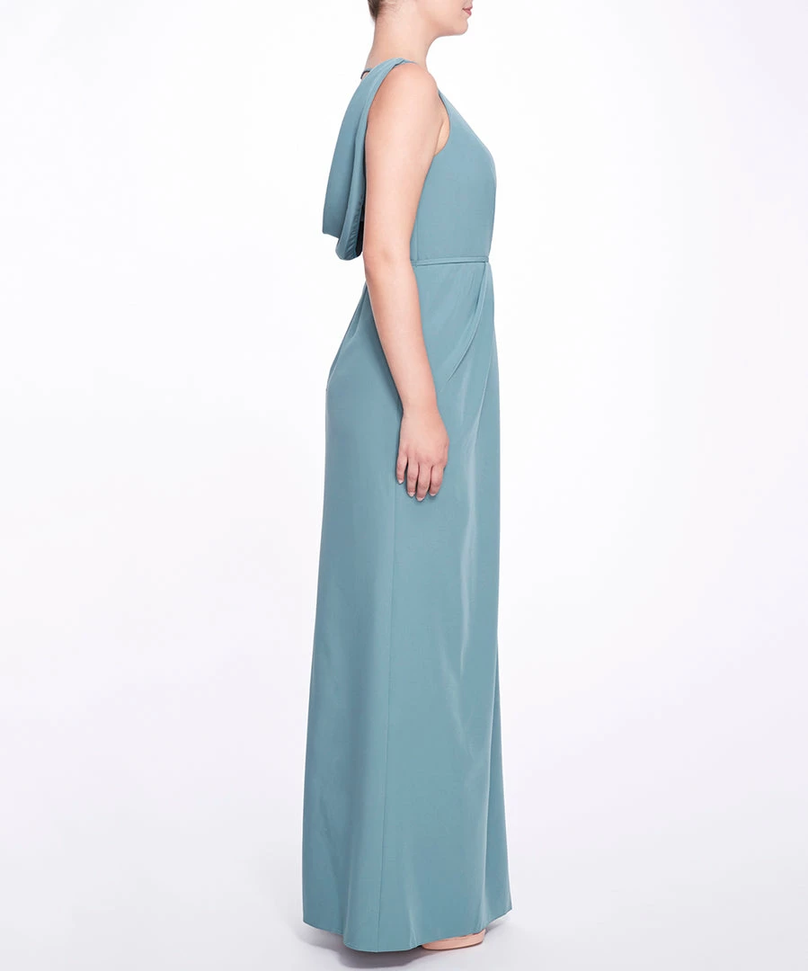 The Molise is a column gown featuring a V-neck design and an enticing cowl back detail.