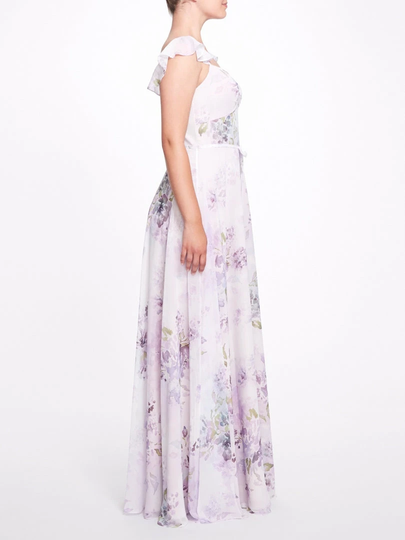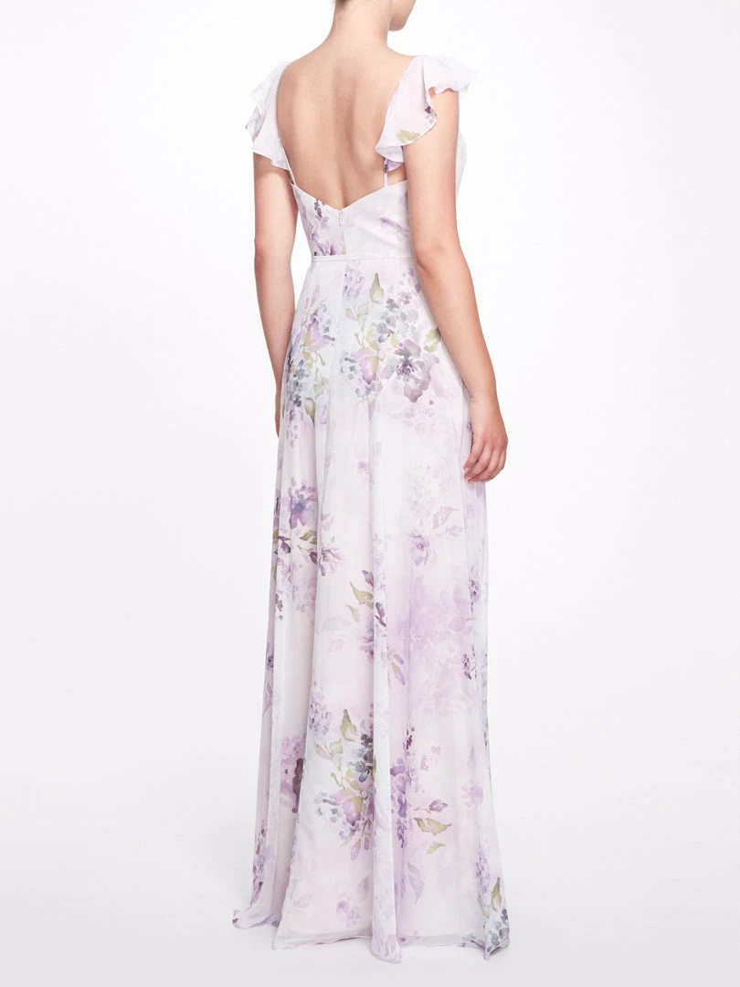 The Naples gown features a watercolor printed chiffon, cami straps with a ruffled multi-wear sleeve, and a dainty waist tie.Â