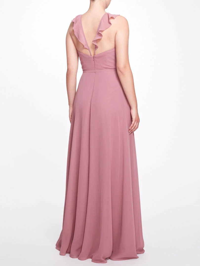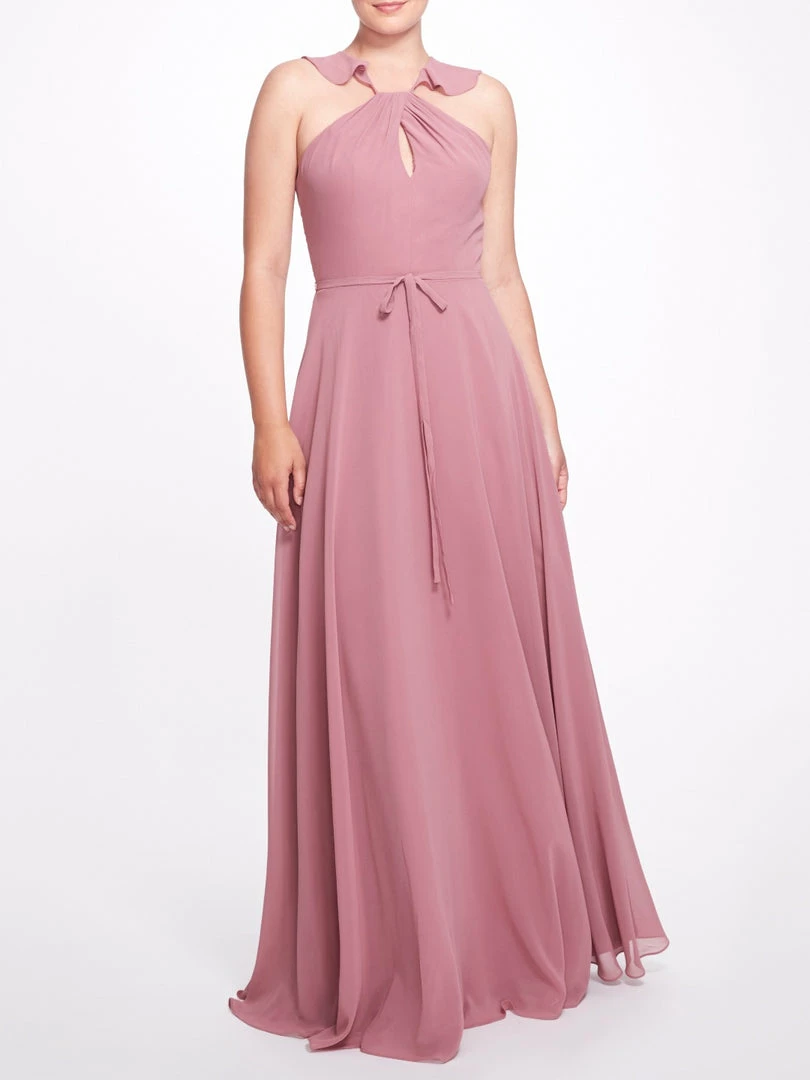 Step out in the effortless Pavia gown. Featuring delicate chiffon, a charming halter neck with a ruffle detail, a subtle keyhole neckline, and a dainty bow around the waist.