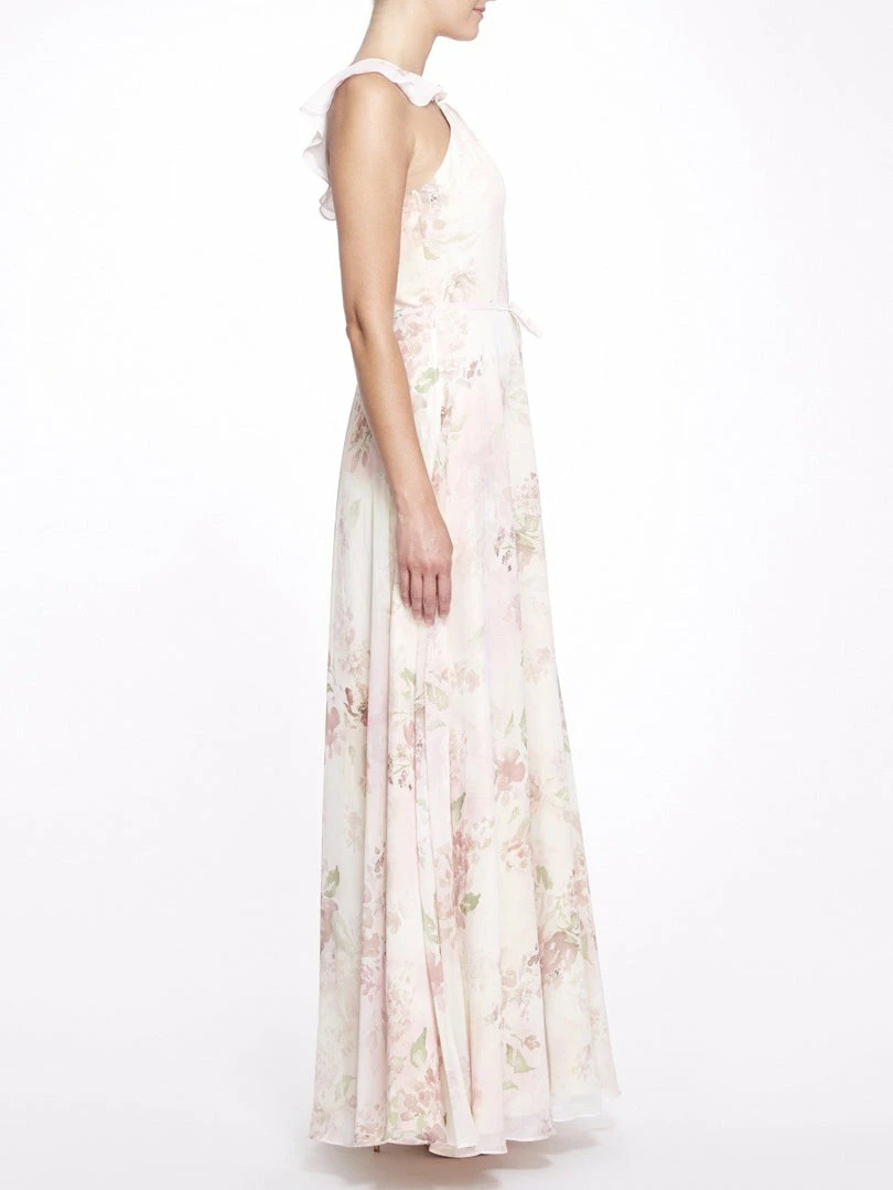 Step out in the effortless Pavia Printed gown. Featuring delicate printed chiffon, a charming halter neck with a ruffle detail, a subtle keyhole neckline, and a dainty bow around the waist.