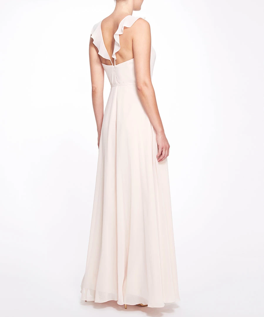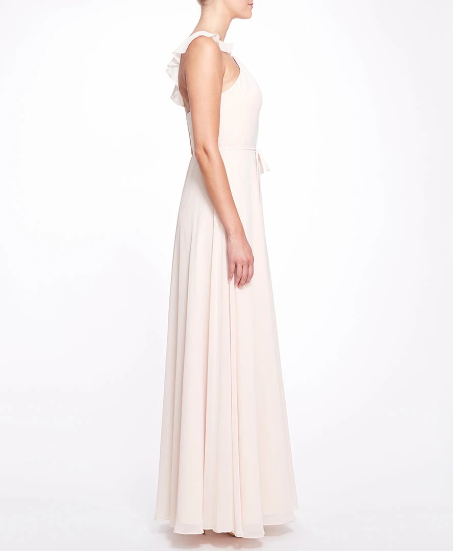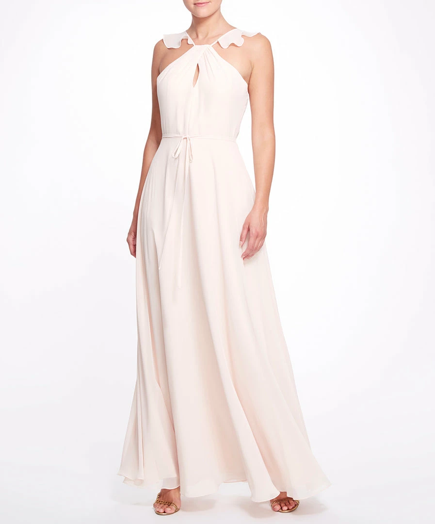 Step out in the effortless Pavia gown. Featuring delicate chiffon, a charming halter neck with a ruffle detail, a subtle keyhole neckline, and a dainty bow around the waist.