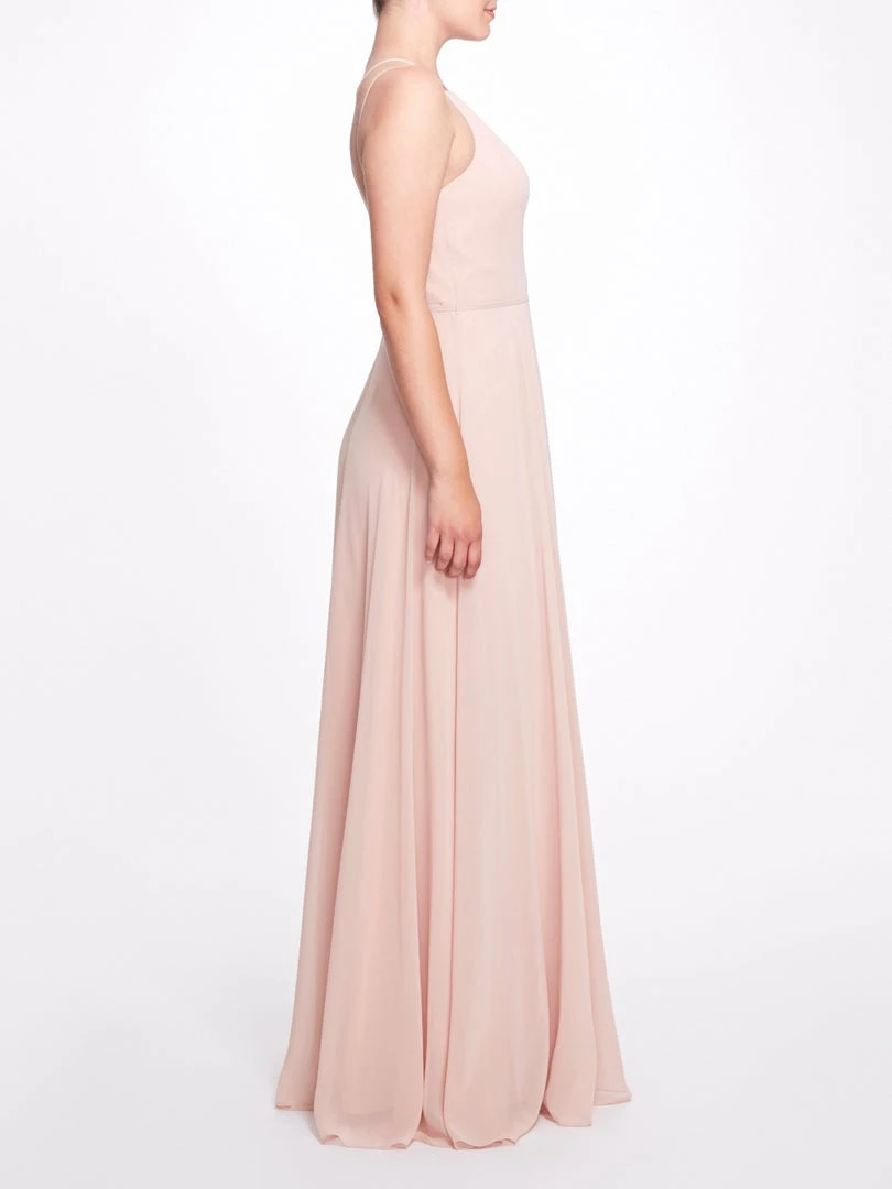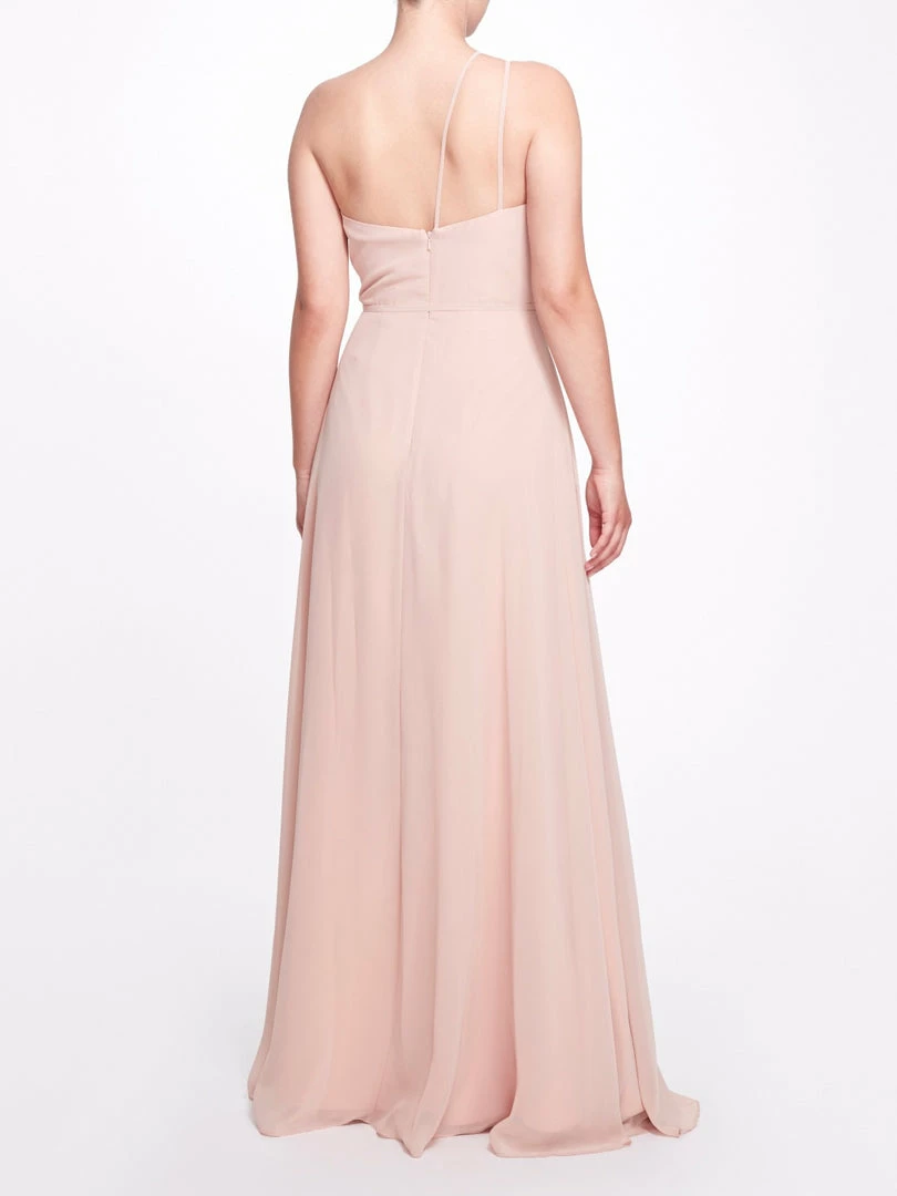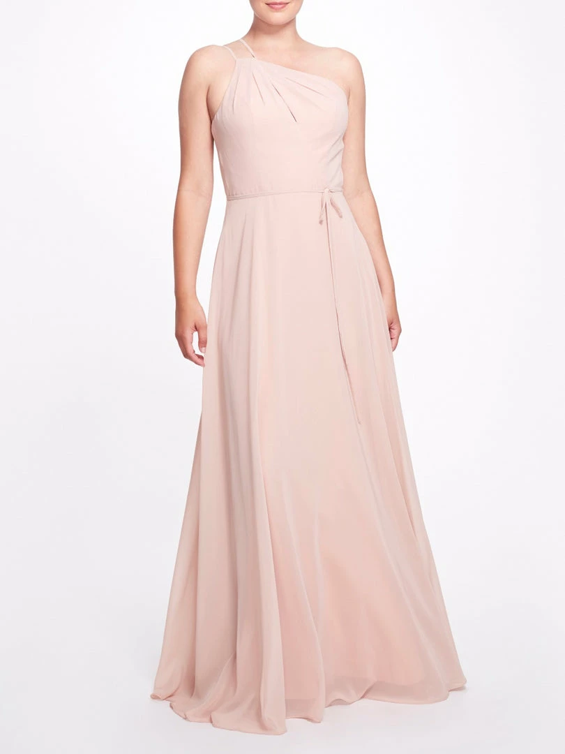 The Pescara gown is the epitome of glamour with a one-shoulder design and peekaboo detail.
