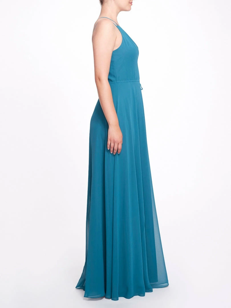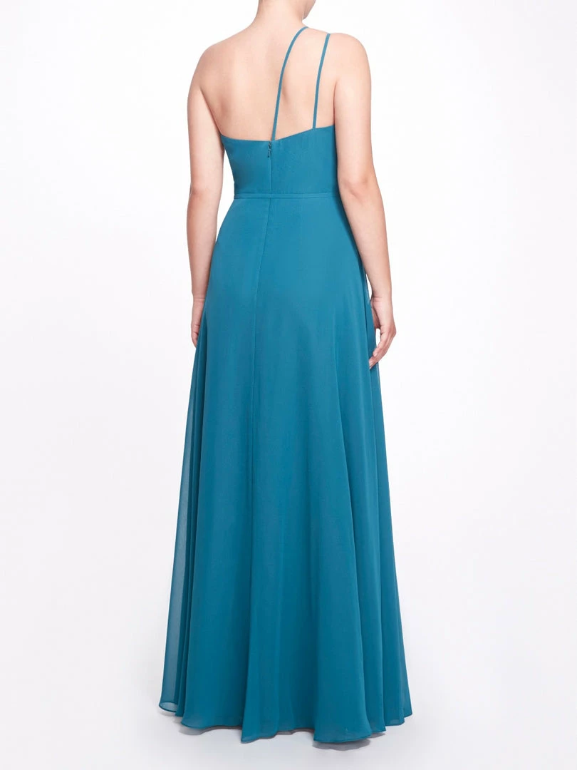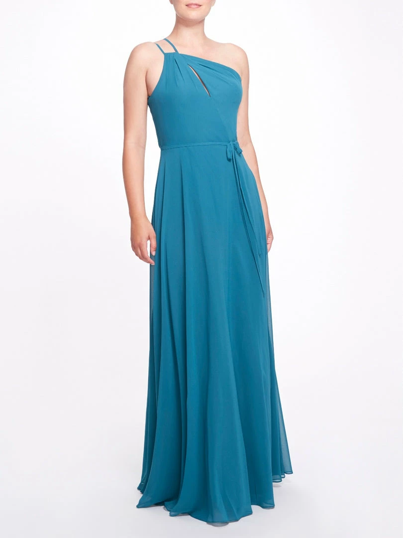 The Pescara gown is the epitome of glamour with a one shoulder design and peekaboo detail.