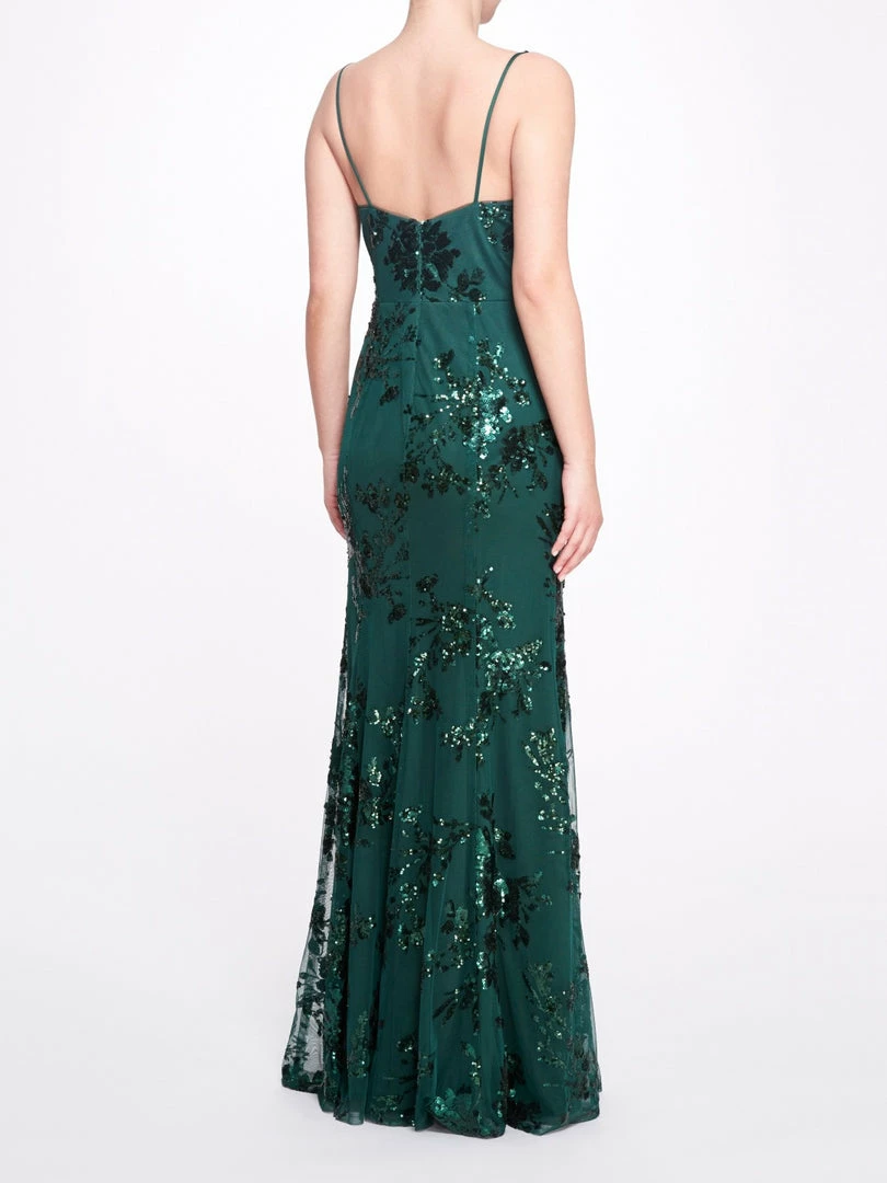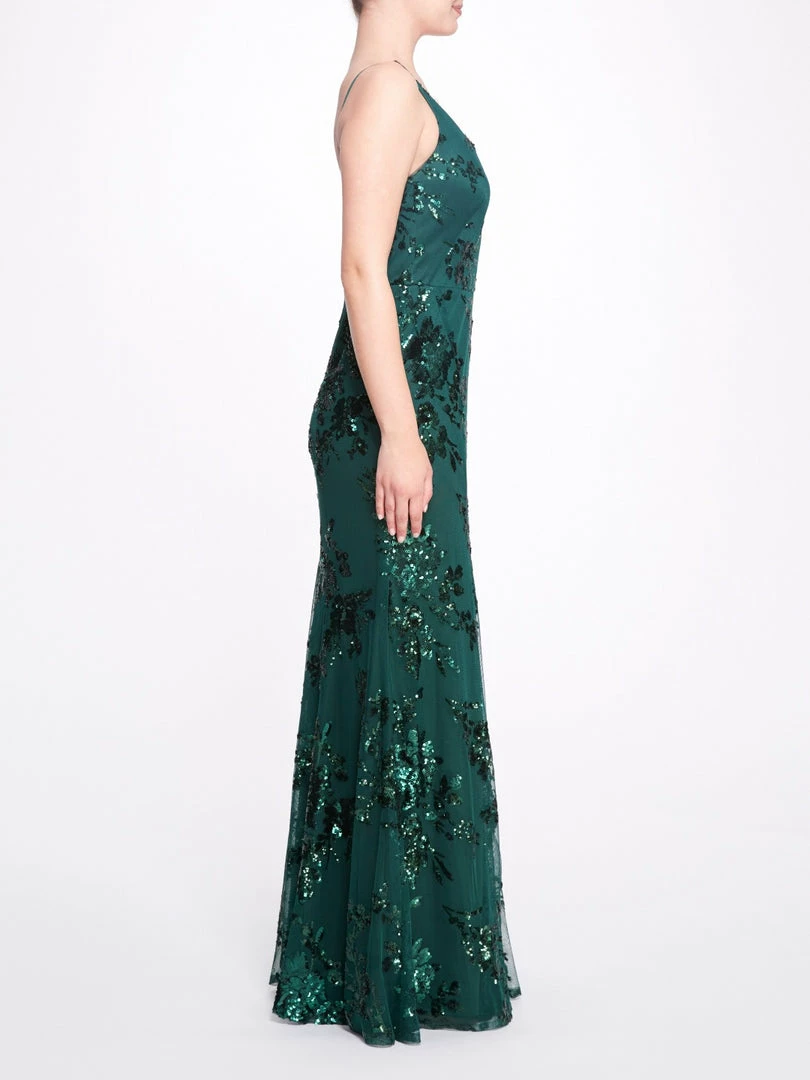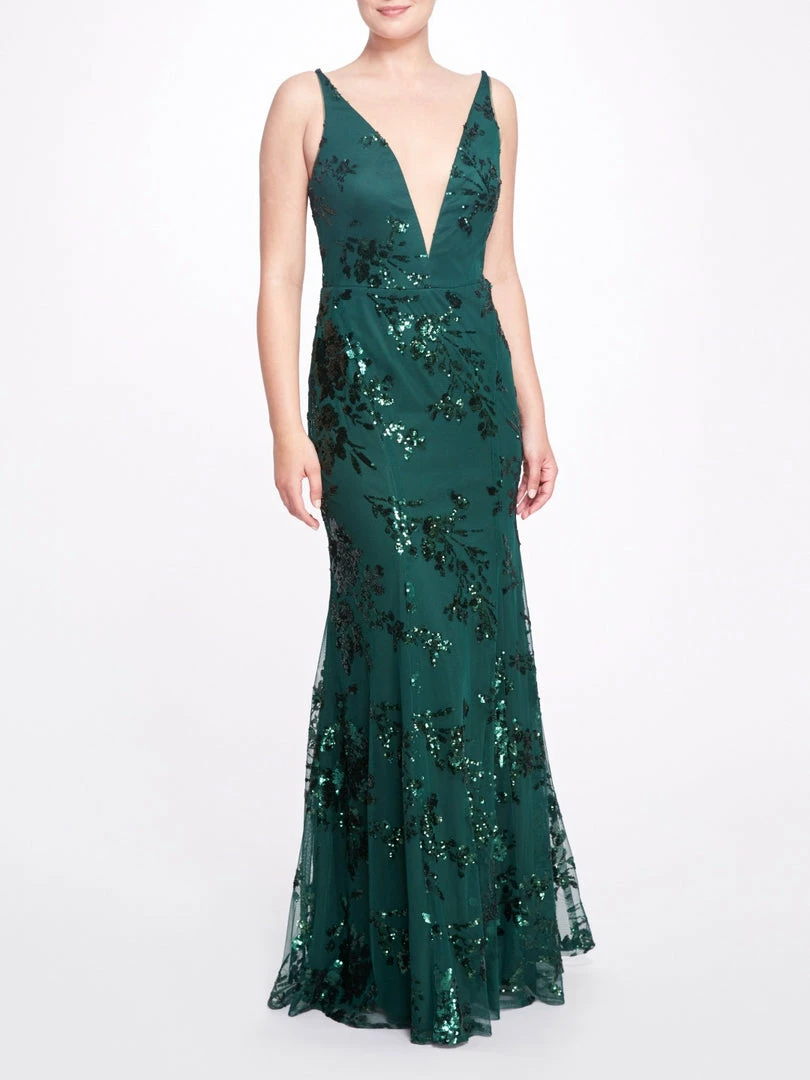 The Pisa gown features a romantic plunge v-neckline, fit and flare silhouette, and embroidered floral sequins.