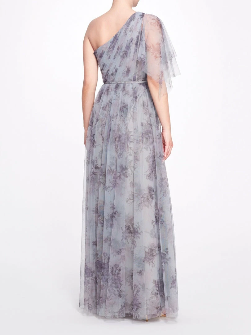 The Pomezia is a floral printed tulle gown featuring a handkerchief sleeve, one-shoulder neckline, and tie waist.