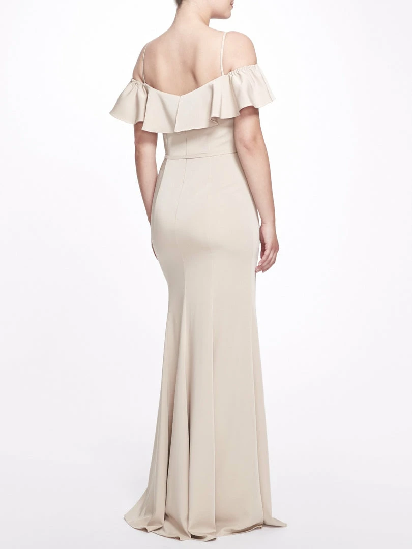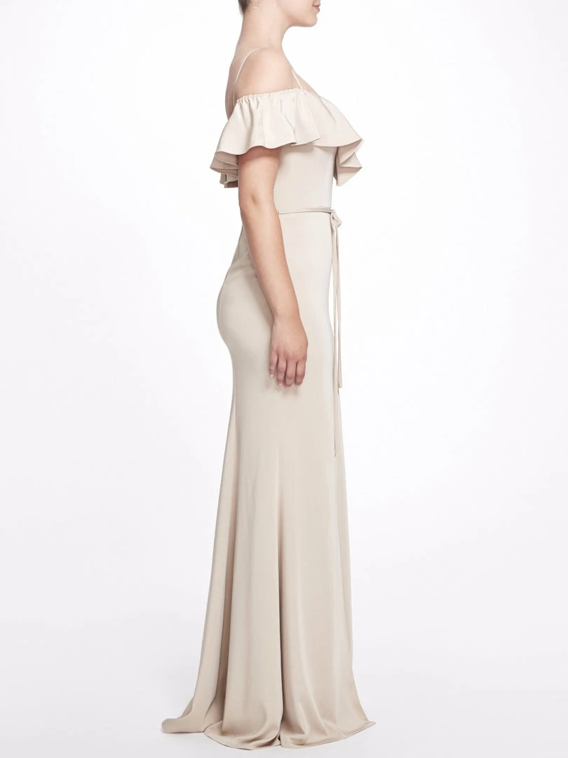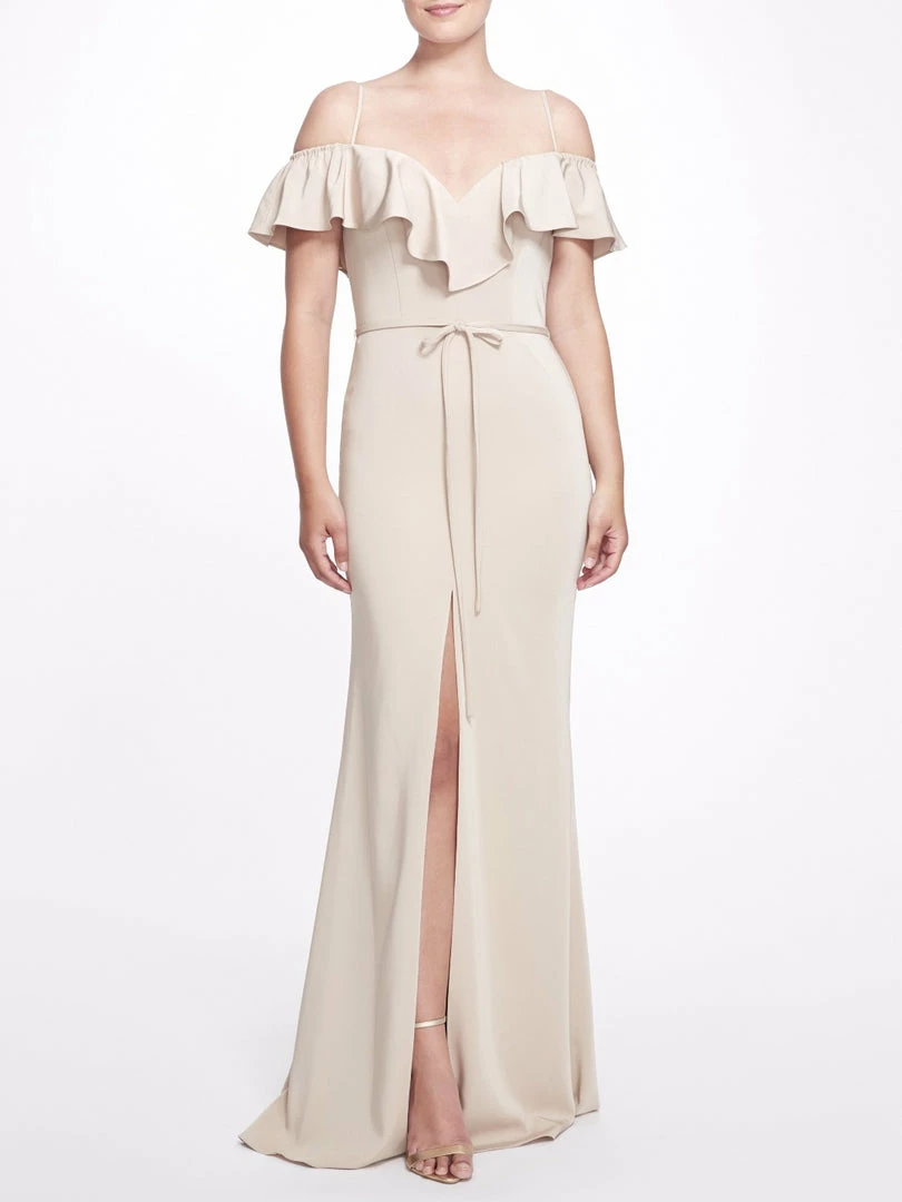 The Rivoli gown features cami straps, a shoulder ruffle, and frontal leg slit.