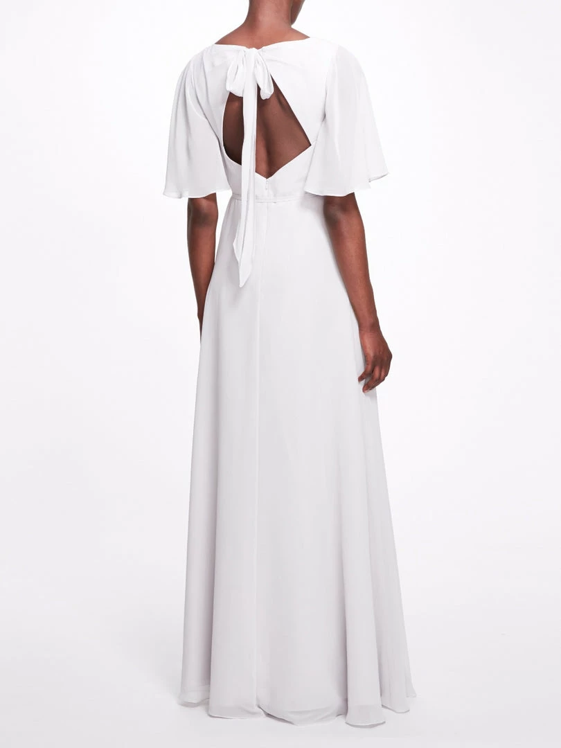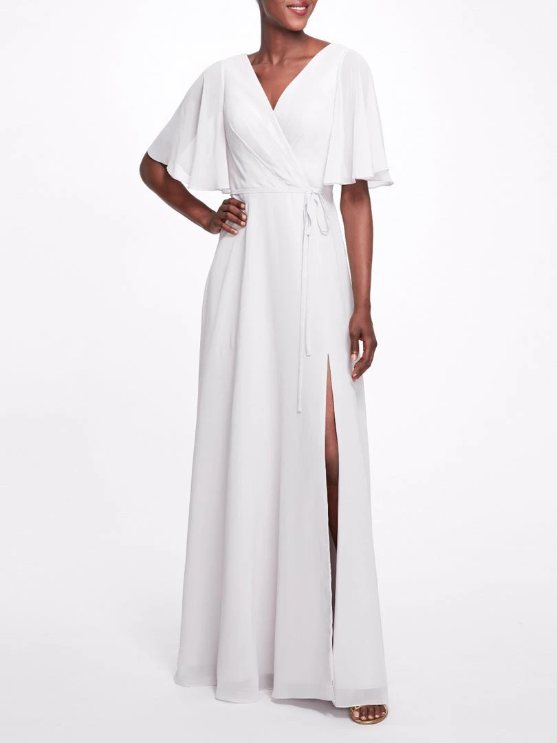 All eyes will be on you at your next event in the Rome gown. Featuring dreamy short flutter sleeves, a charming wrap neckline, an open back with an enchanting bow, and a delightful leg slit.