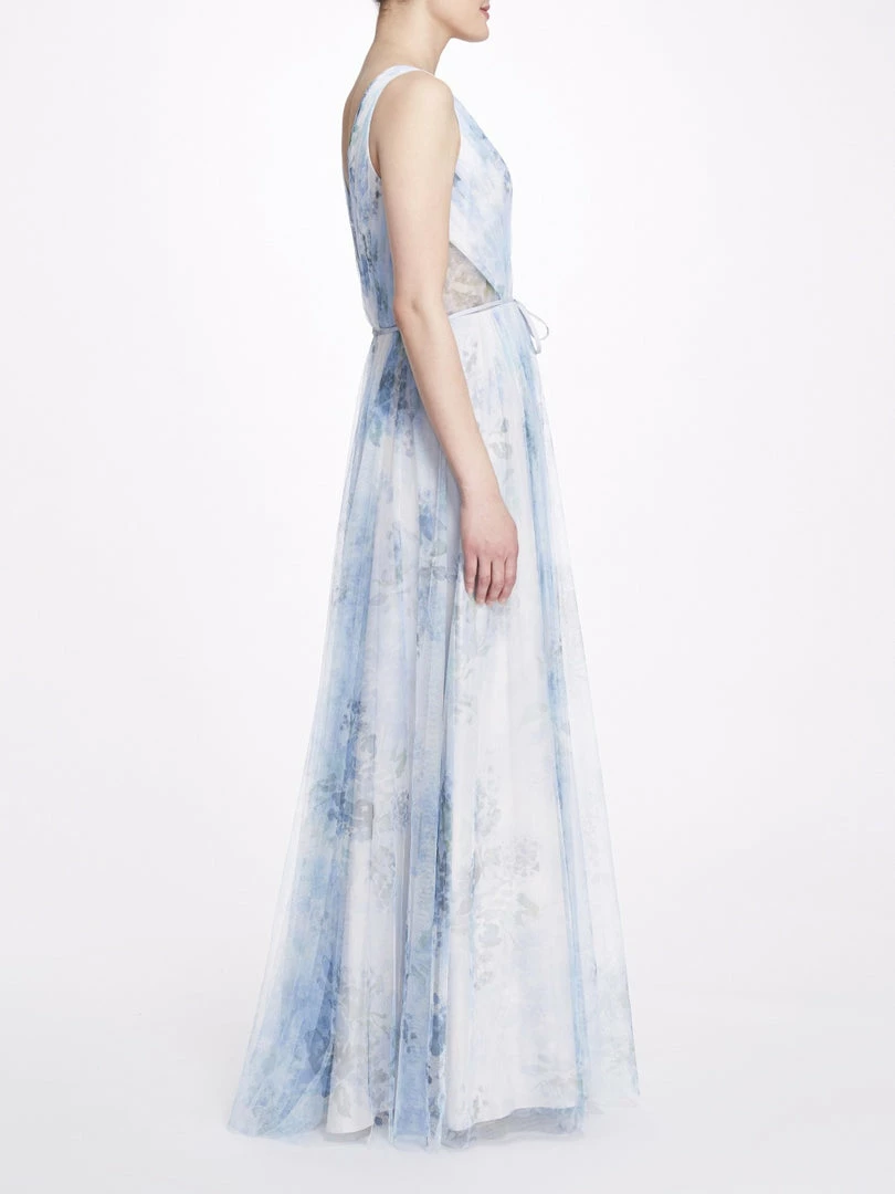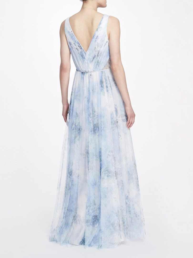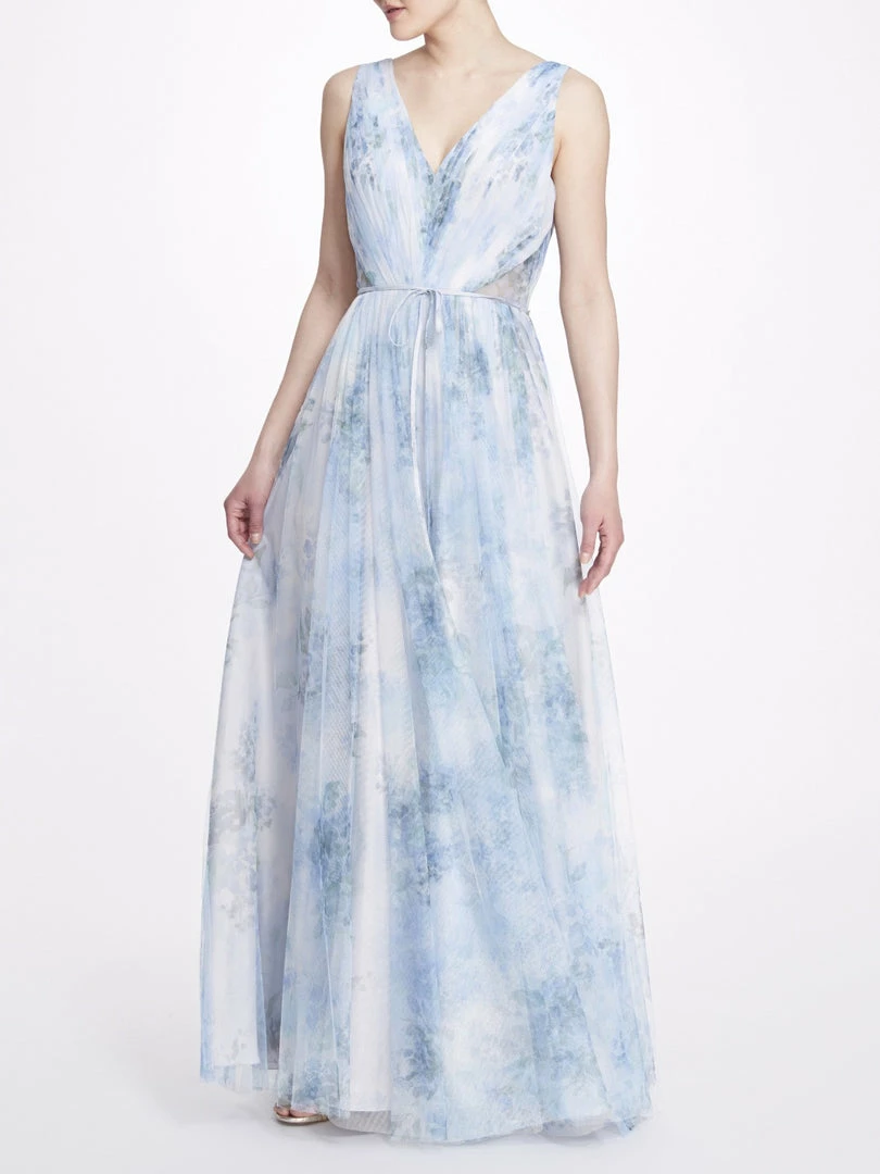 Modern romance becomes an effortless reality in the Sora Printed gown. Featuring an amorous pleated bodice, a lush ribbon belt at the waist, and a soft neckline.