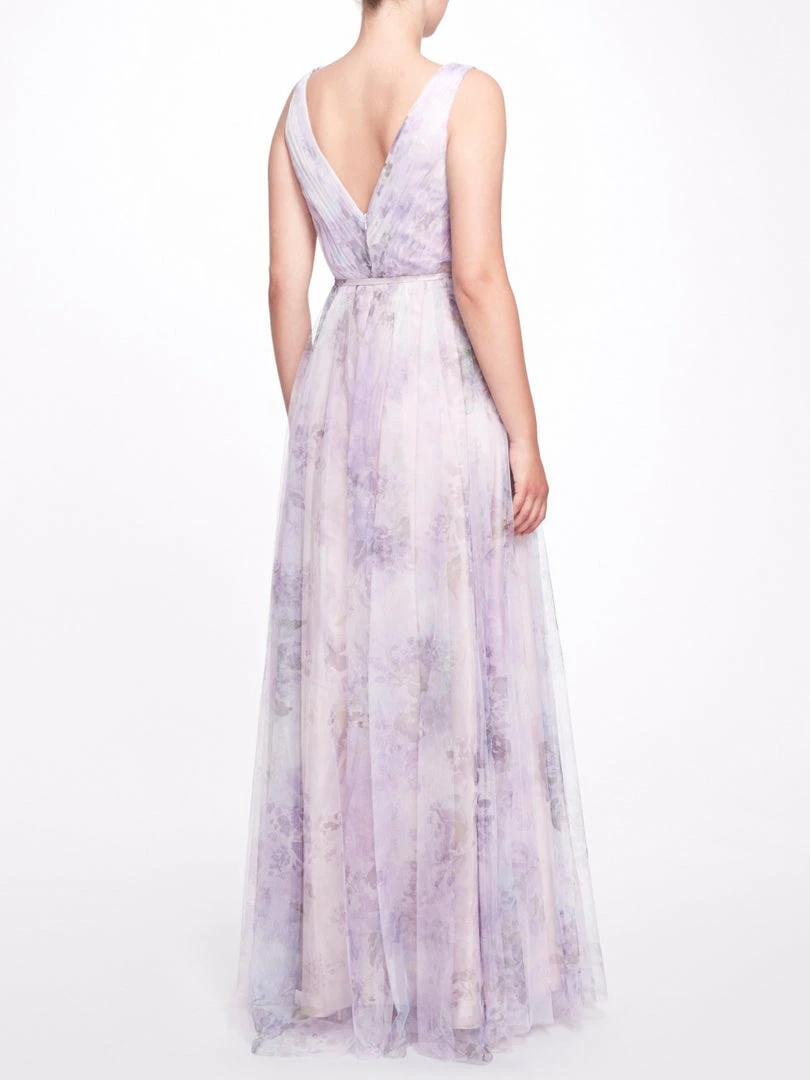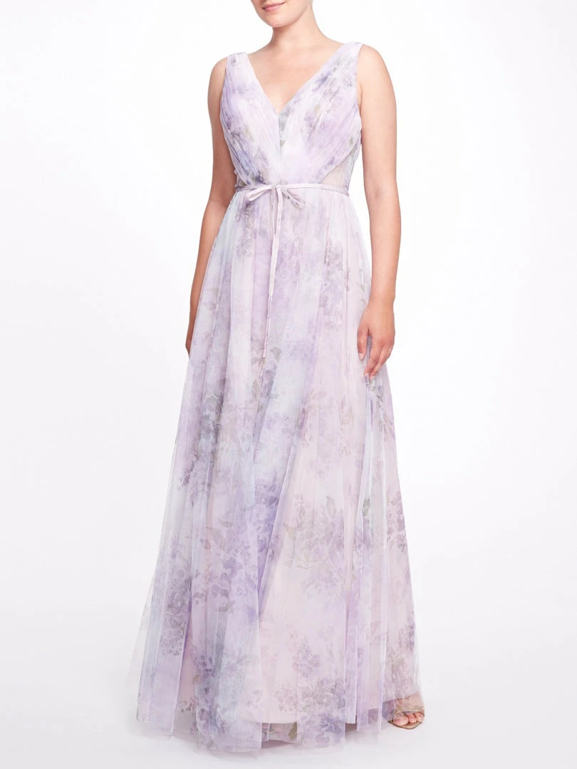 Modern romance becomes an effortless reality in the Sora Printed gown. Featuring an amorous pleated bodice, a lush ribbon belt at the waist, and a soft v-neckline.