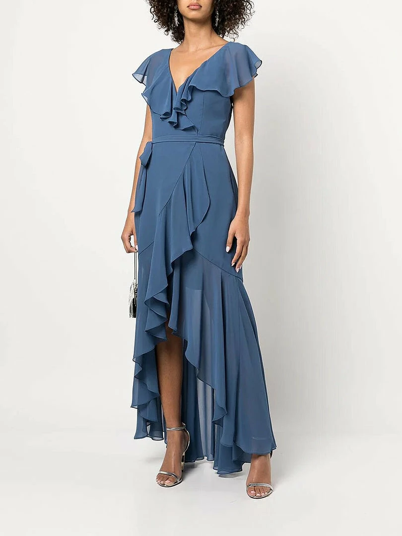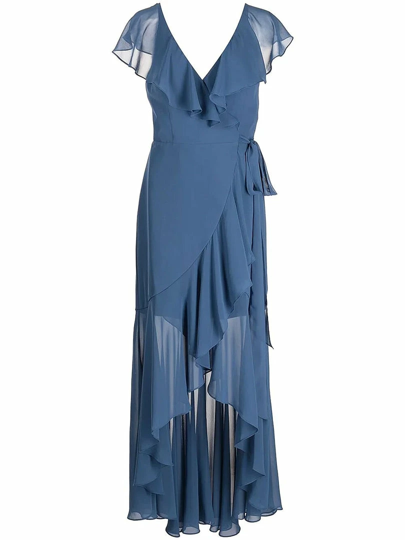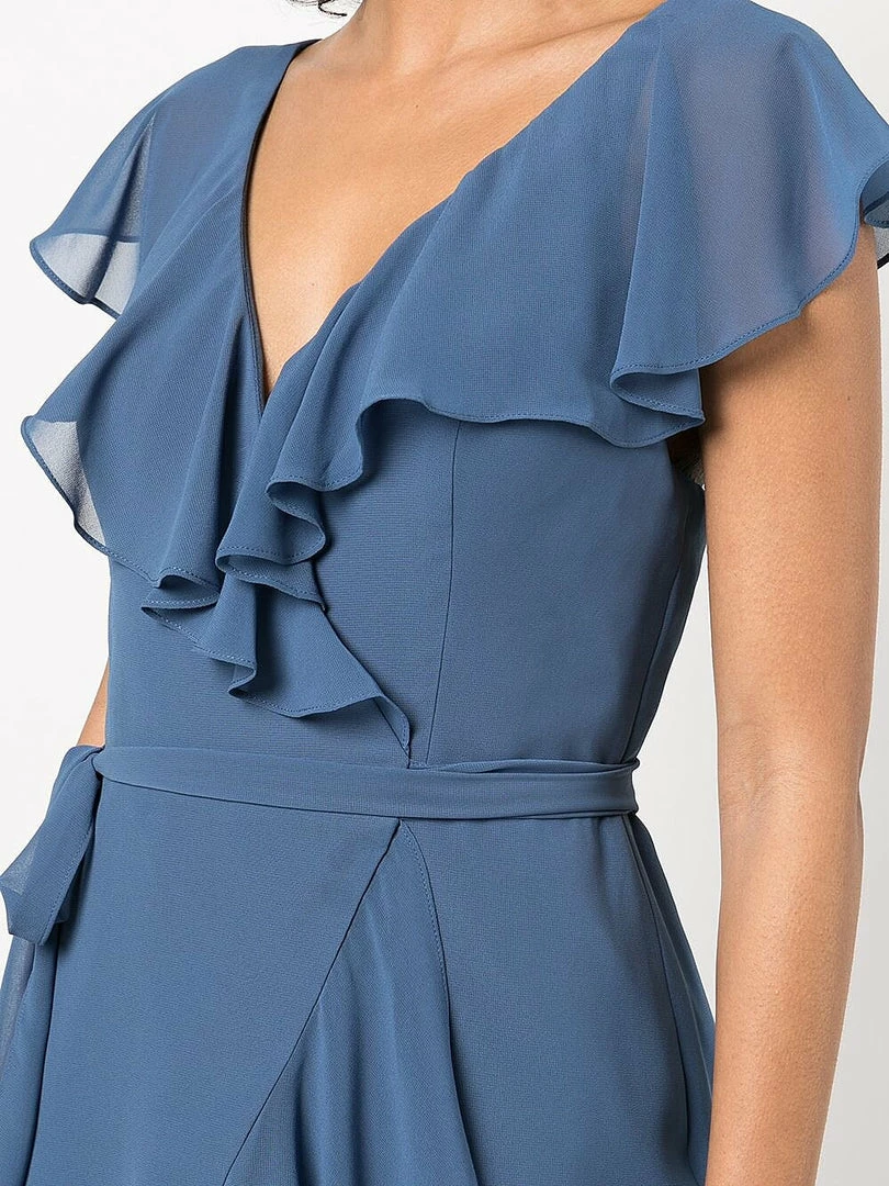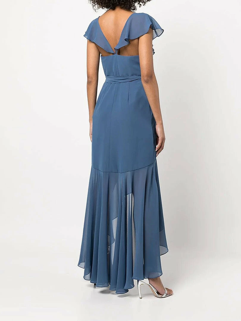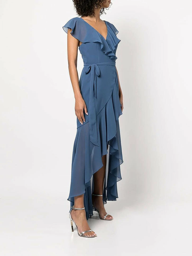 Sleeveless v-neck high-low ruffle-trim wrap gown with sheer panels and tied waist