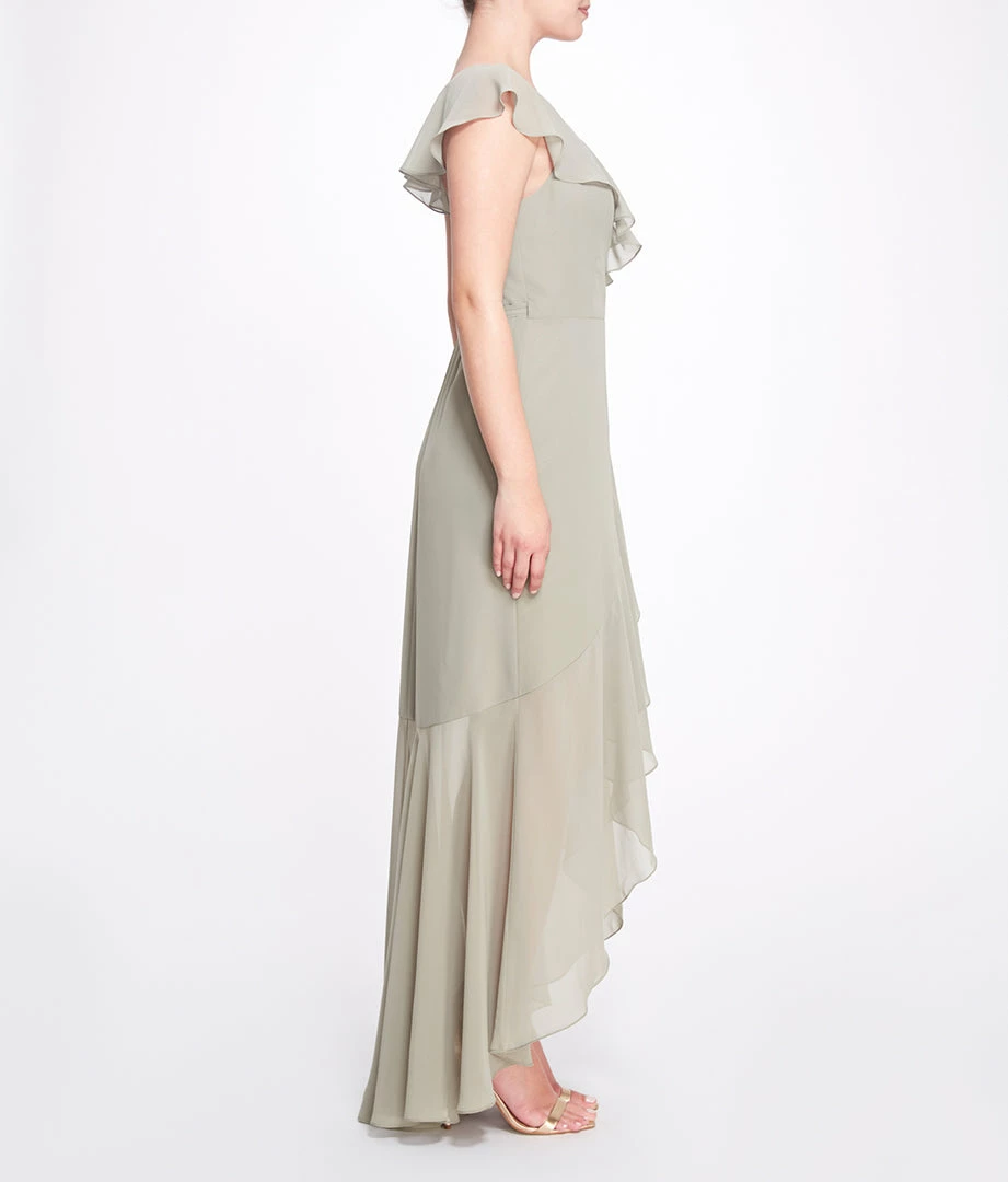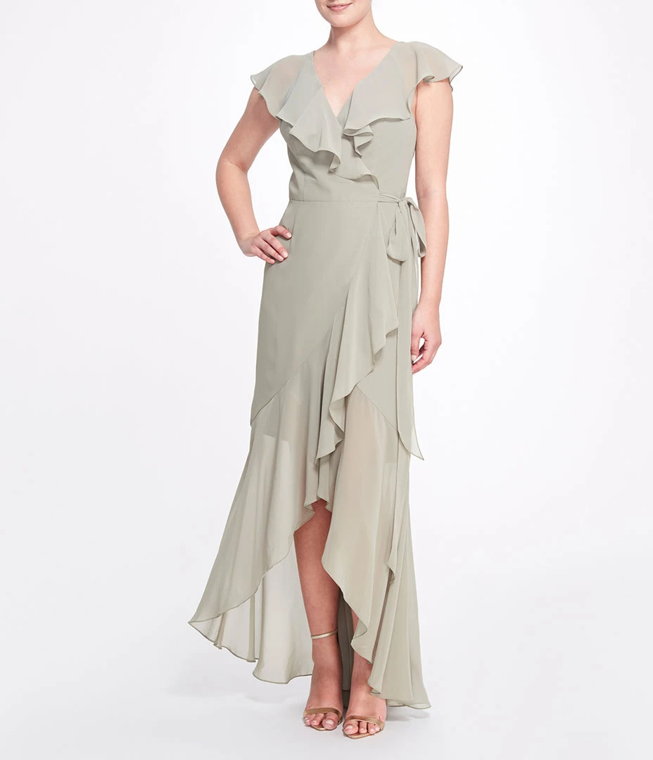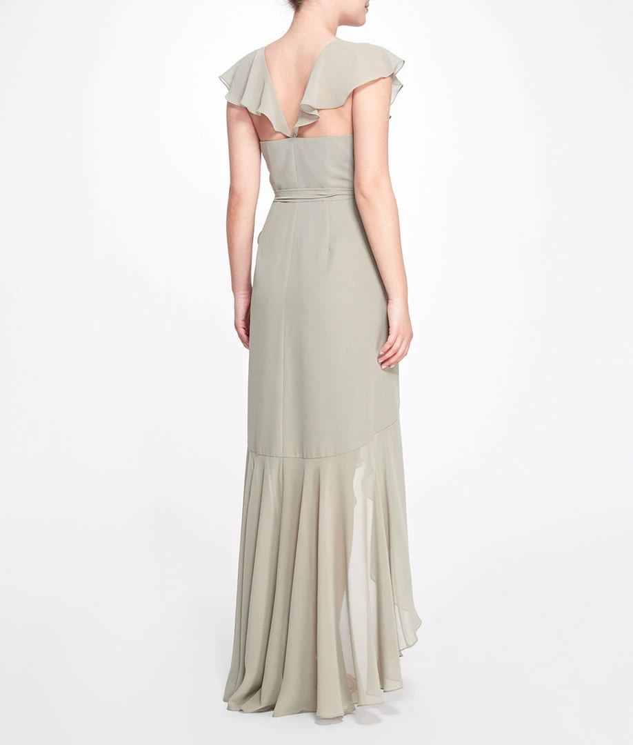 Sleeveless v-neck high-low ruffle-trim wrap gown with sheer panels and tied waist