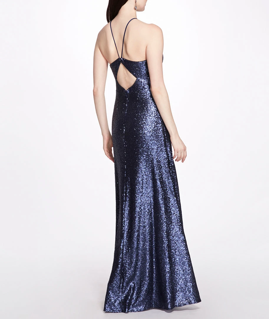The Varena gown is a romantic option for day or night. You will dazzle at the party in this gown, featuring enchanting sequins, a daring open back, and an alluring halter neck.