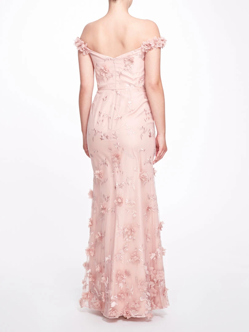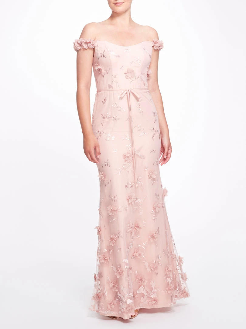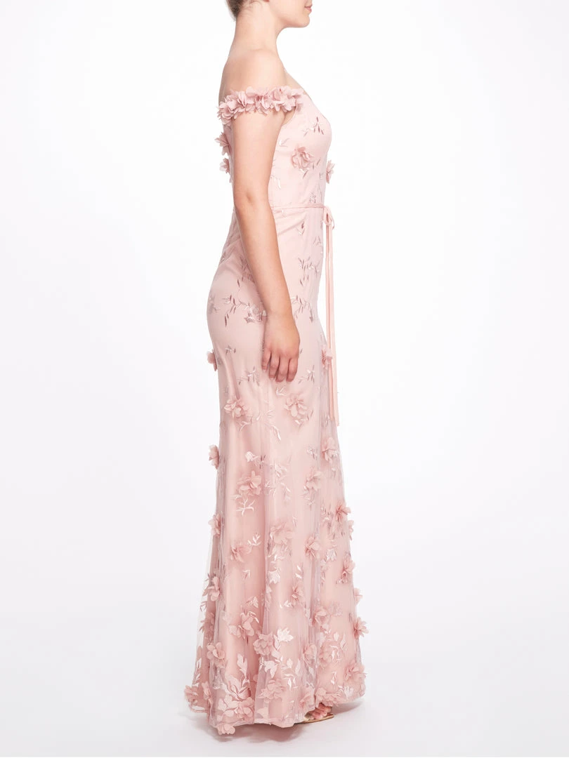 Bloom all year round in the Venice gown. Featuring romantic floral appliqués, a graceful off the shoulder design, a cinched waist with a dainty bow, and a charming fit to flare silhouette.