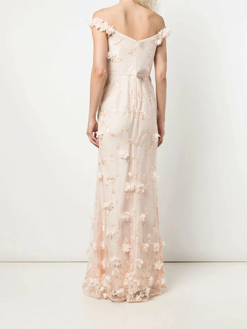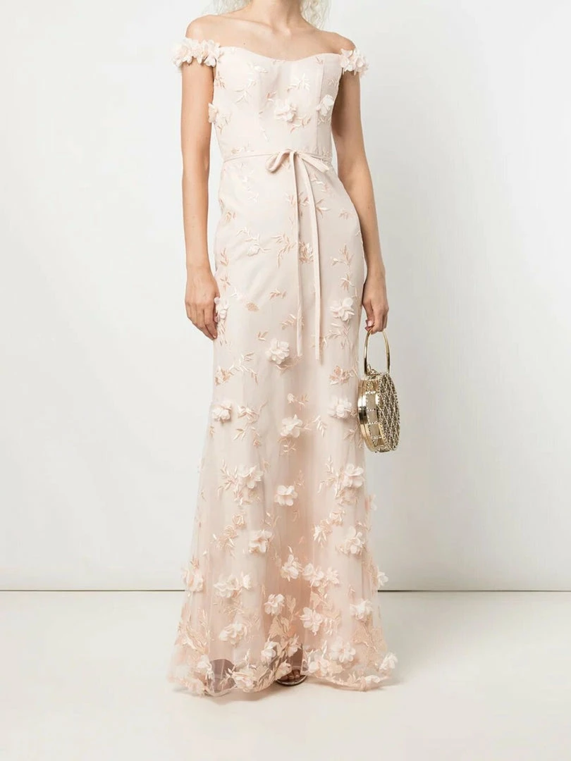 Bloom all year round in the Venice gown. Featuring romantic floral appliqués, a graceful off the shoulder design, a cinched waist with a dainty bow, and a charming fit to flare silhouette.