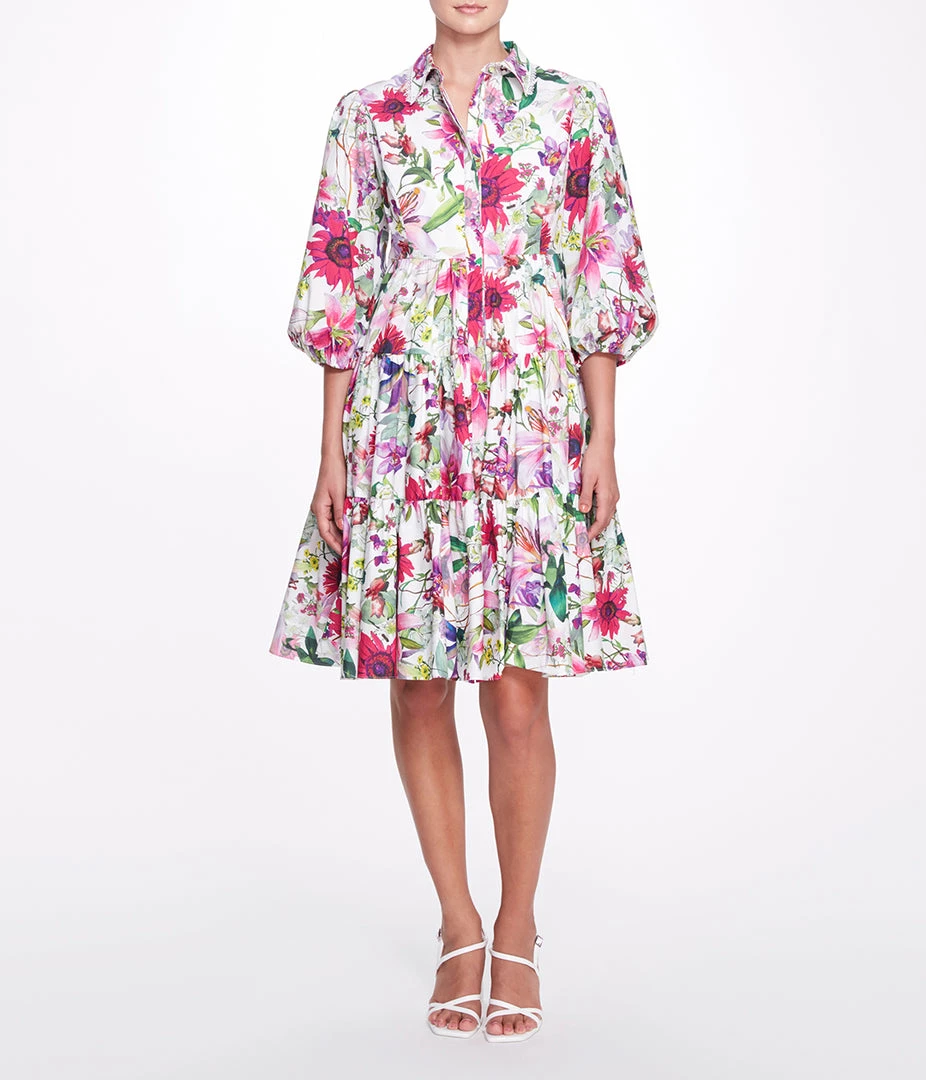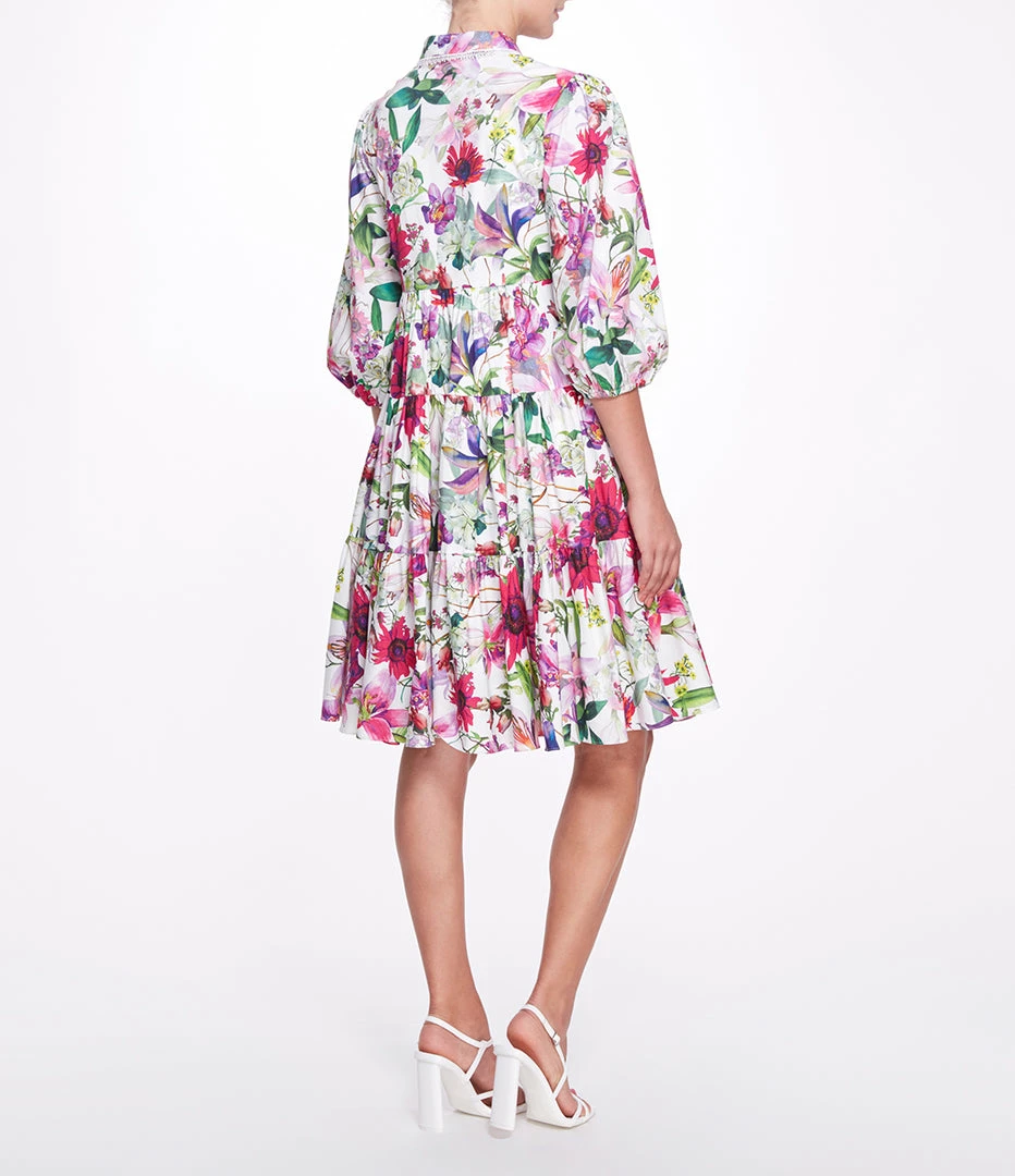 Botanical printed stretch cotton poplin A-line tiered tunic knee-length collared shirt dress with balloon sleeves