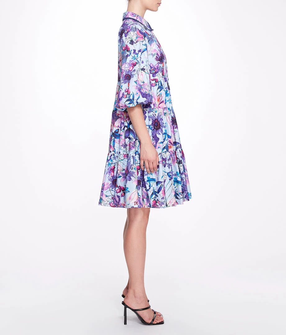 Botanical printed stretch cotton poplin A-line tiered tunic knee-length collard shirt dress with balloon sleeves