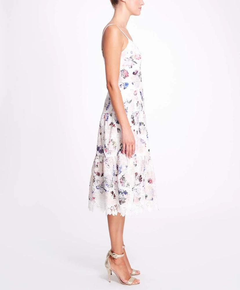 Dutch floral printed chiffon with guipure lace detailing, cami straps, and an a-line skirt. Model is 5 ft 10 wearing size 6.