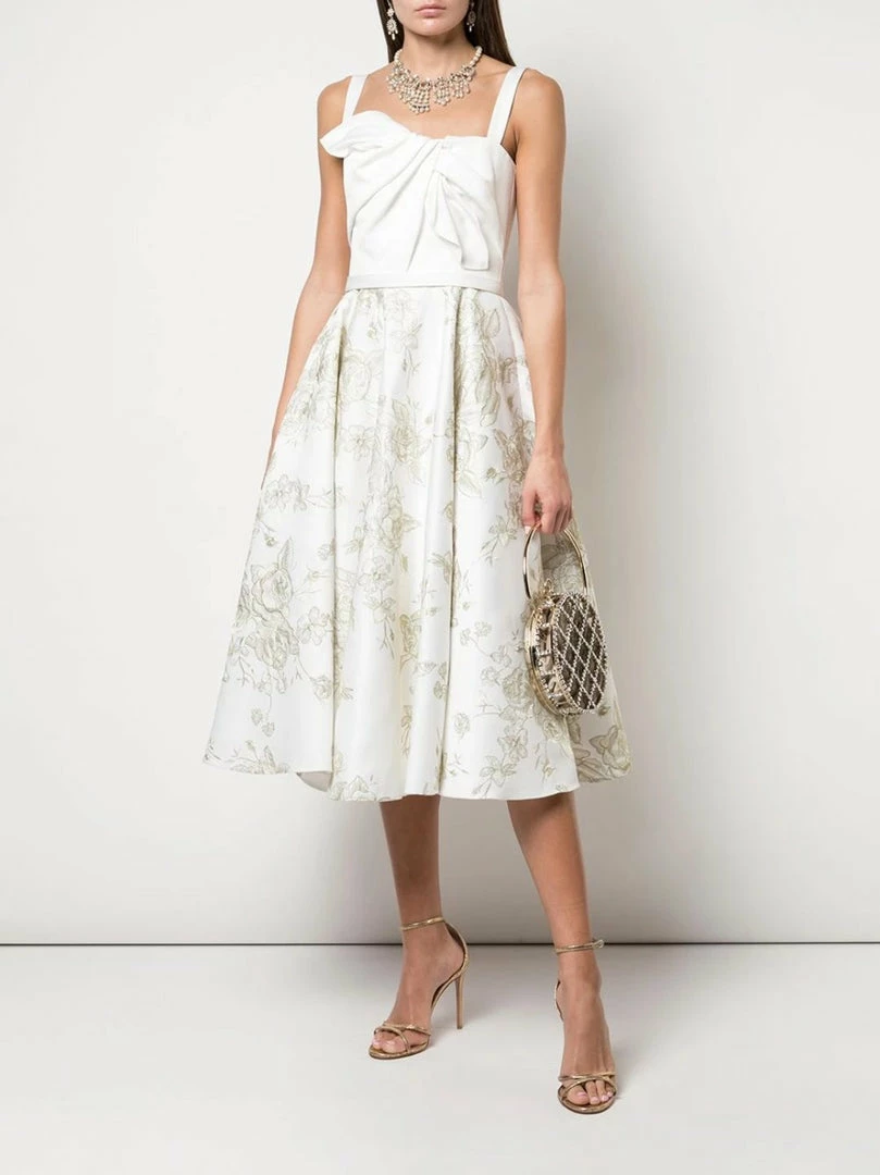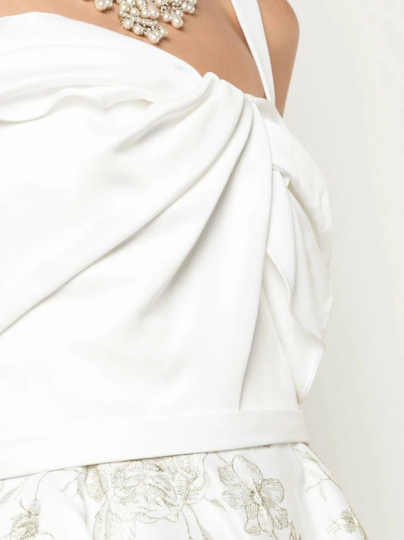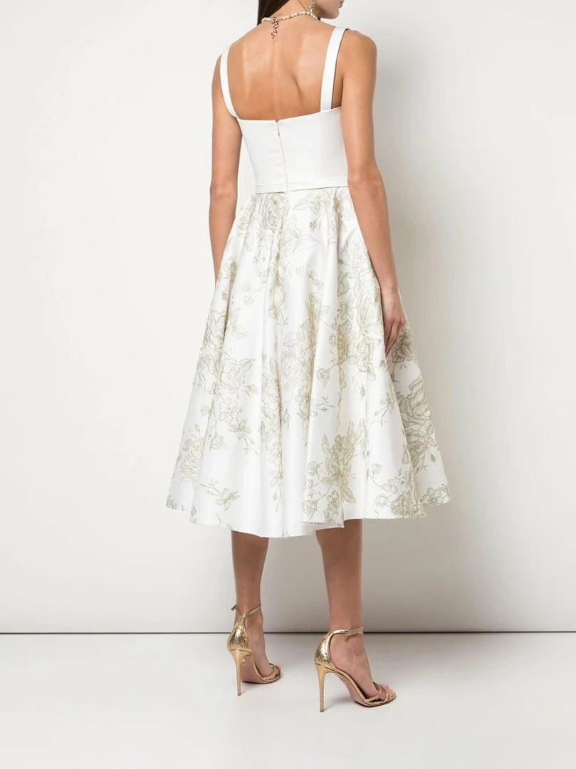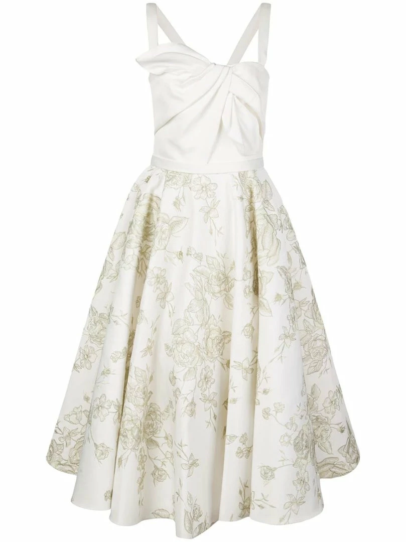 Sleeveless satin mid-length cocktail dress featuring draped details, floral embroideries, a flared skirt, metallic threading, thin straps, a back zip fastening and a flared skirt.
