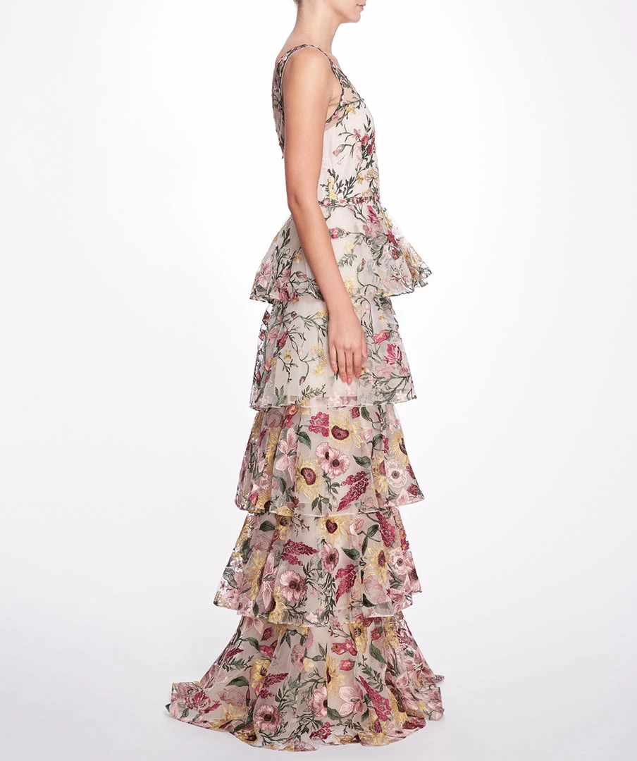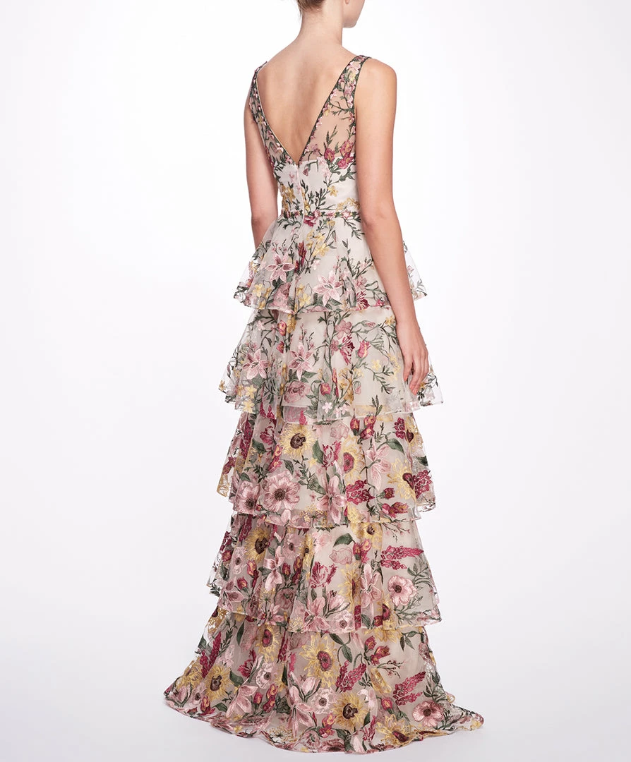 Sleeveless embroidered tulle 5-tier v-neck gown with floral appliqué trim waistband
