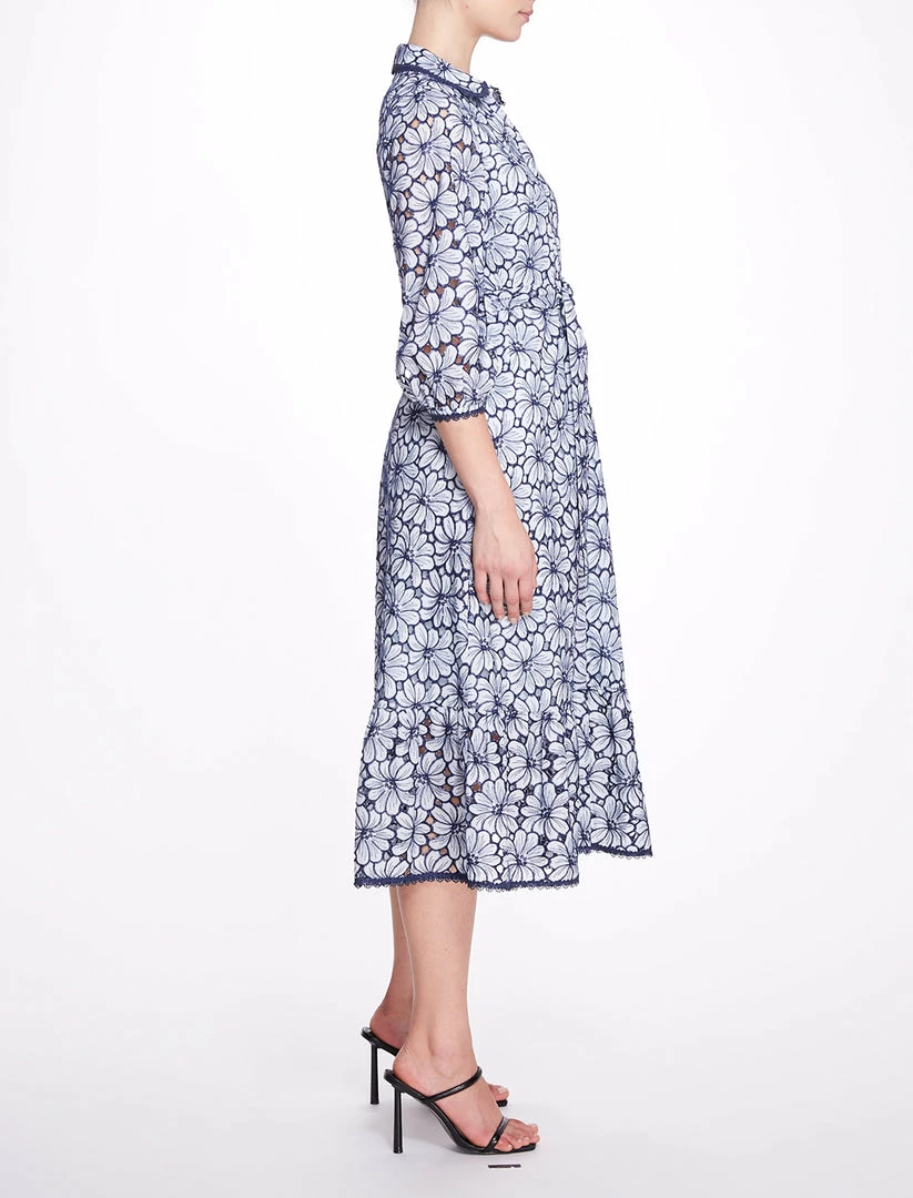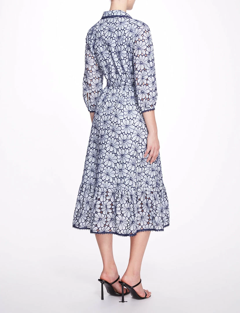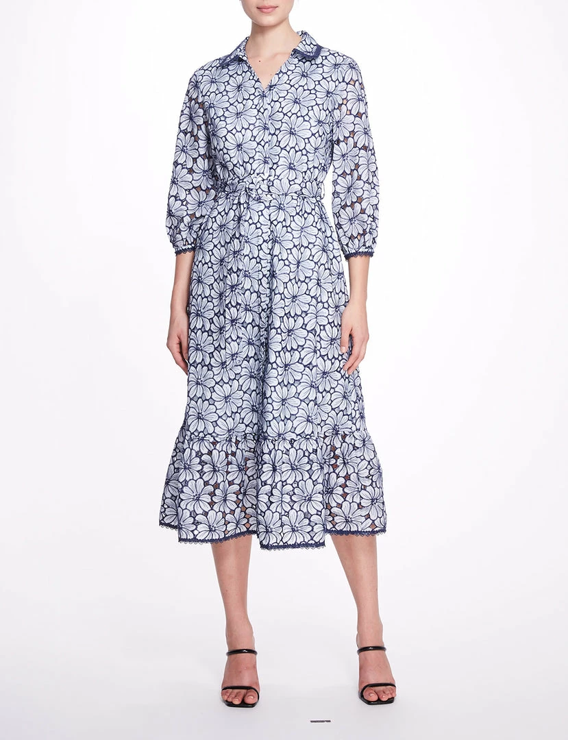Floral embroidered cotton eyelet midi-shirt dress with trimmed collar, three-quarter bishop sleeve, shirred skirt panel and self belt