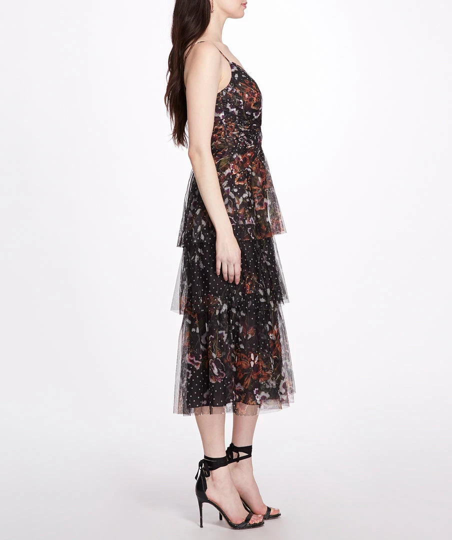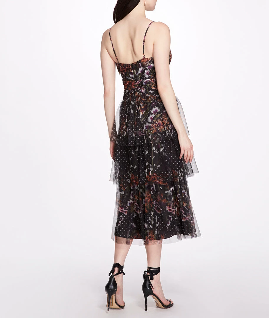 Floral polka dot 3-tiered tulle tea-length gown with delicate cami straps, multicolor floral design, and a deep v-neckline.