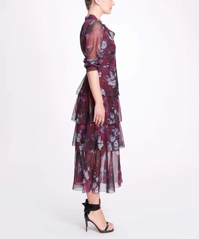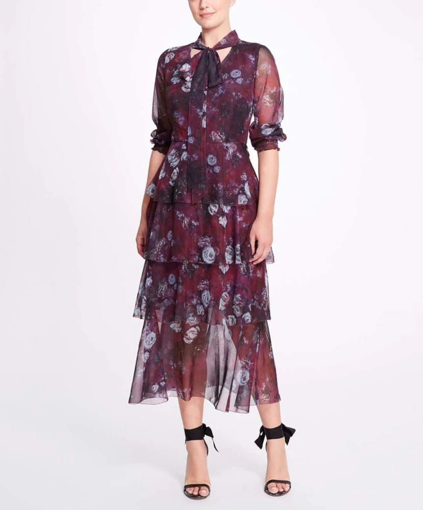 Marchesa Notte Floral Printed Chiffon Tiered Midi Dress