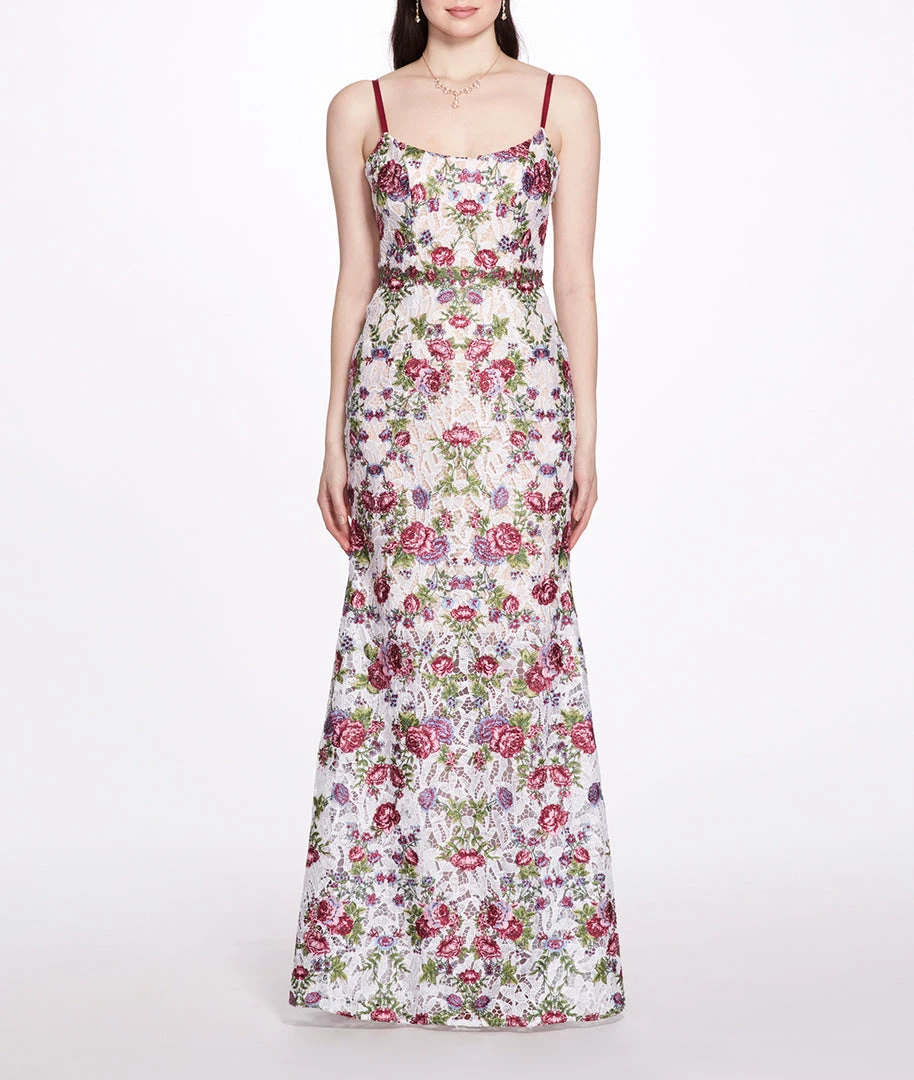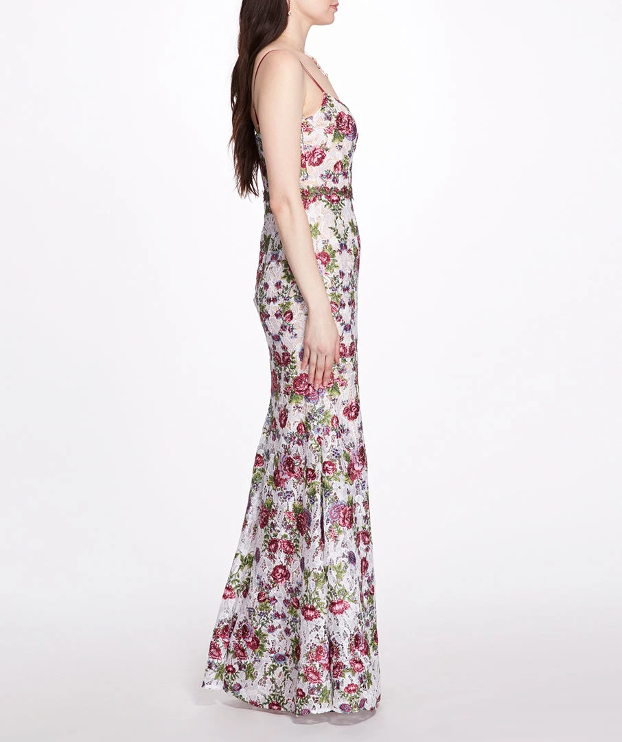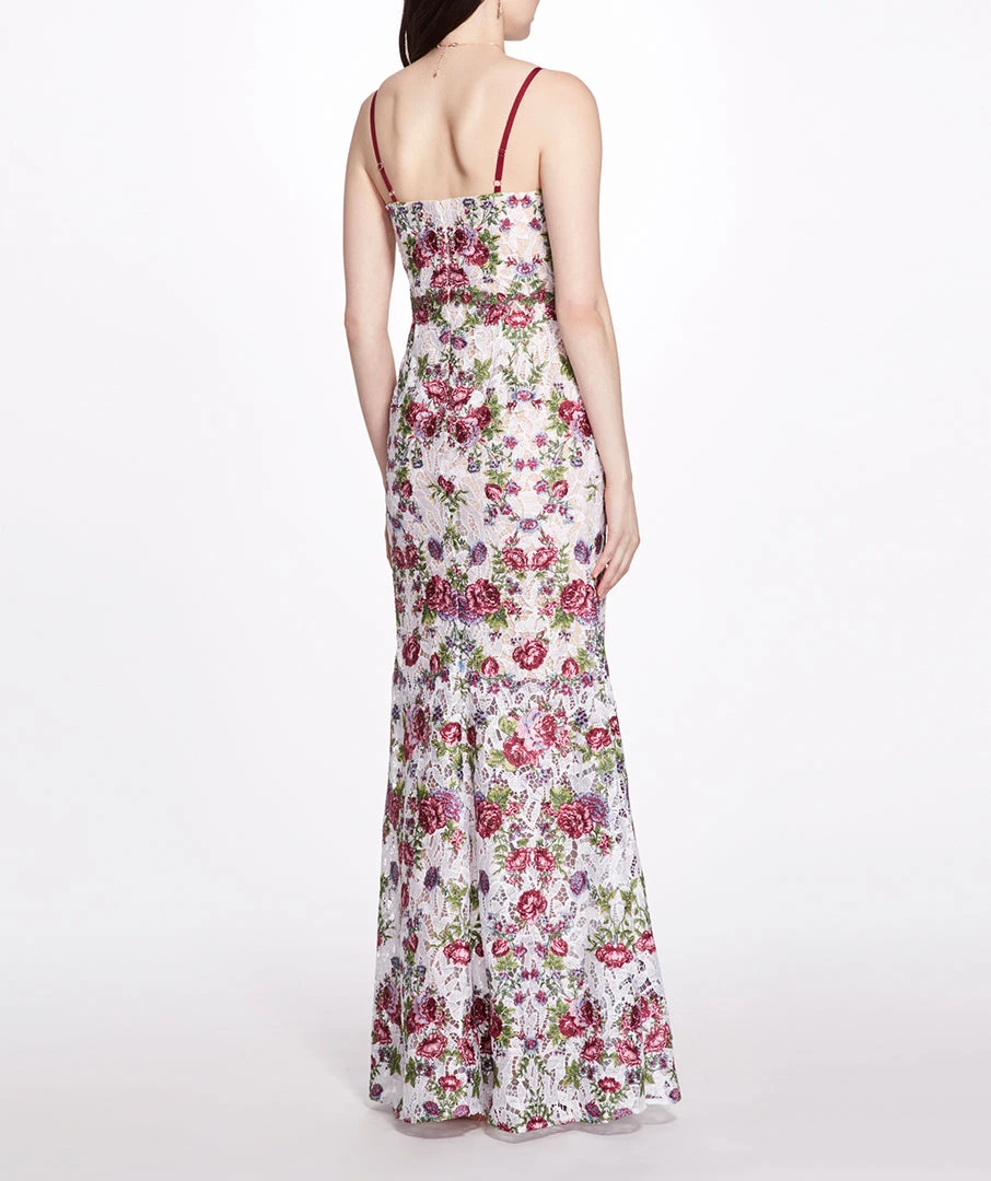 Sleeveless embroidered guipure mermaid gown with corset bodice and floral trim waistband