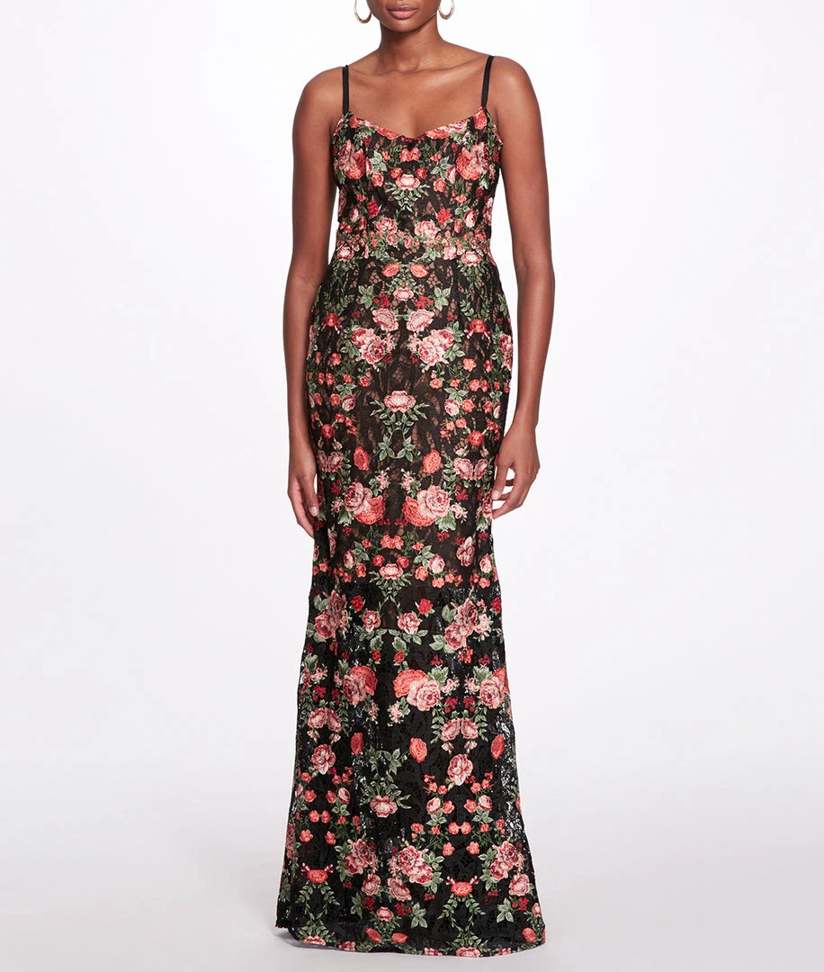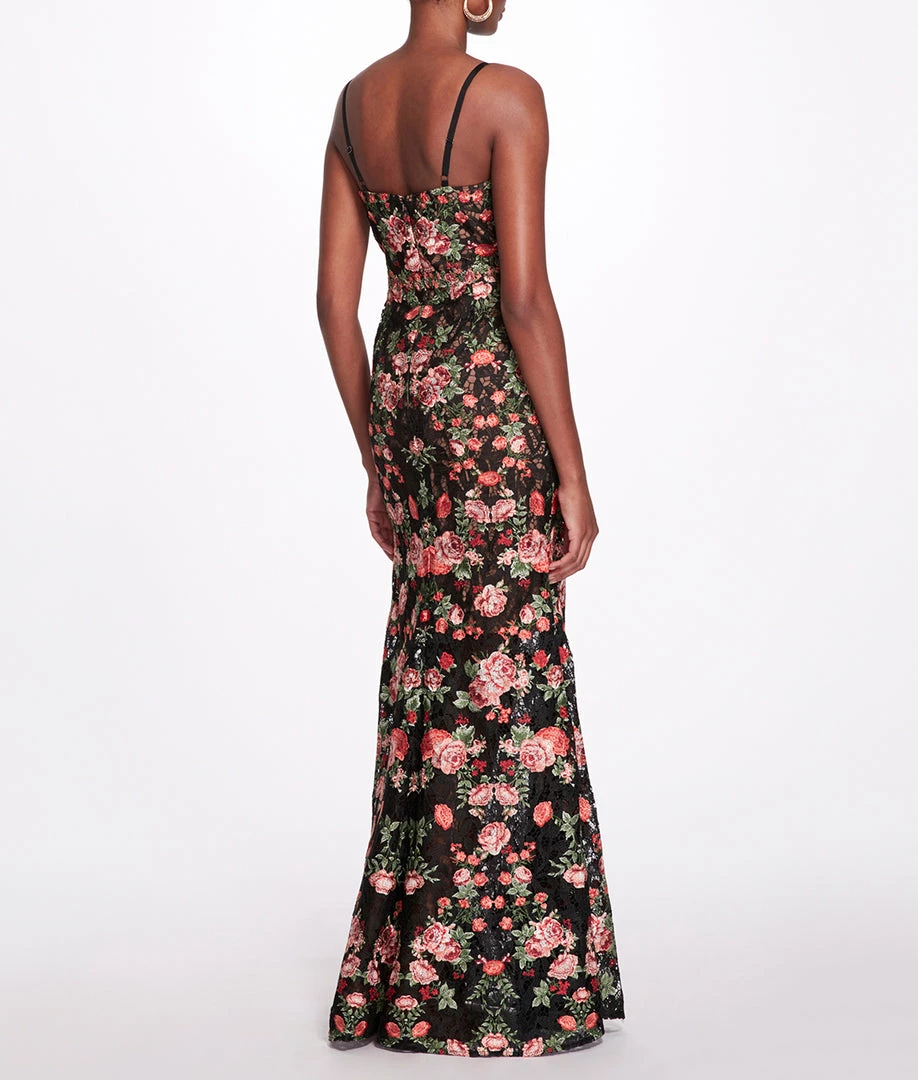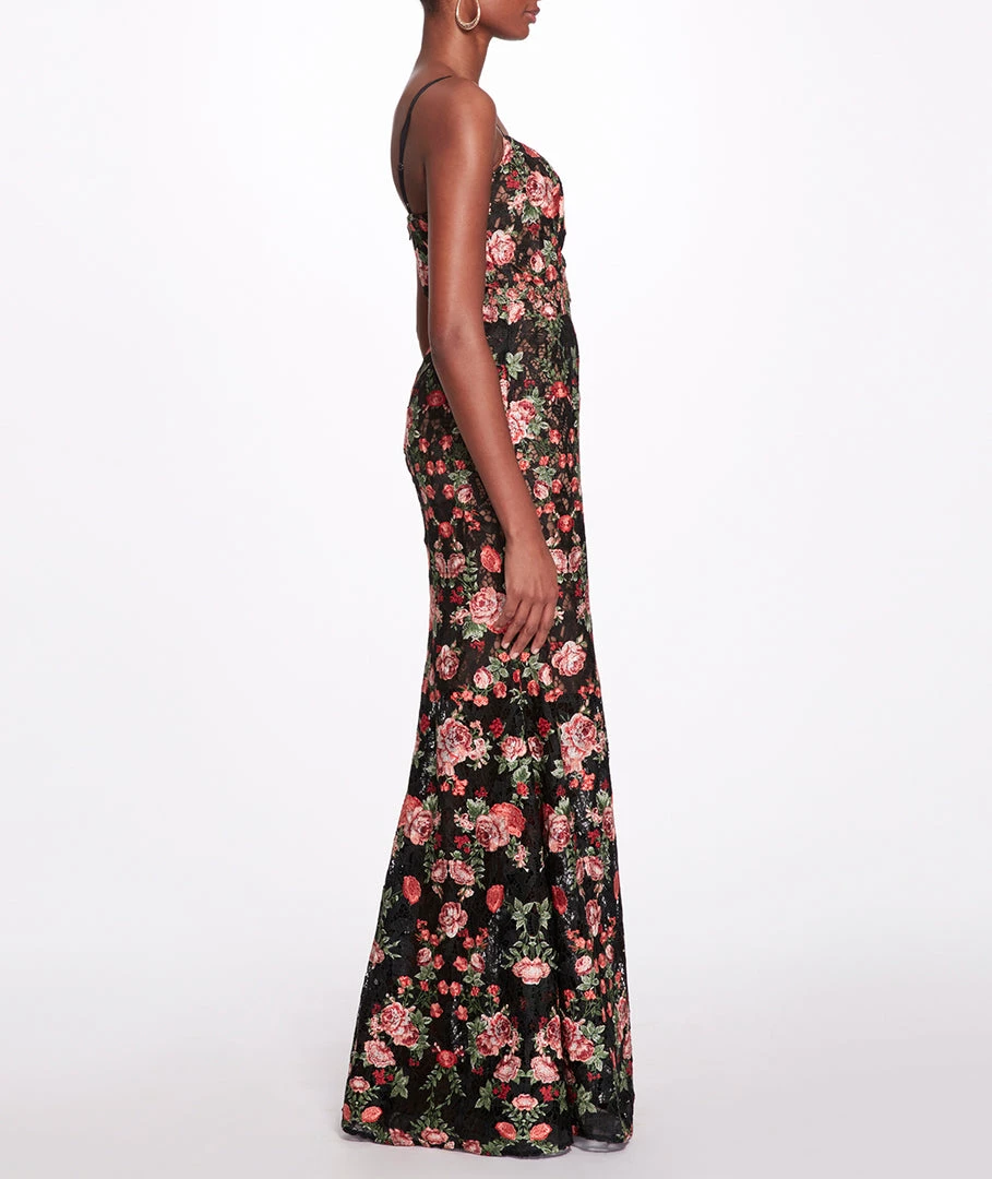 Sleeveless embroidered guipure mermaid gown with corset bodice and floral trim waistband