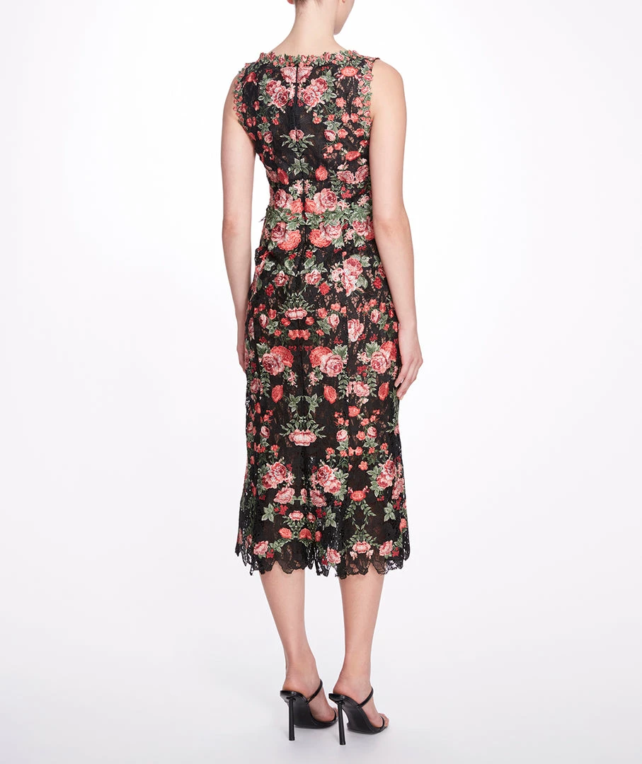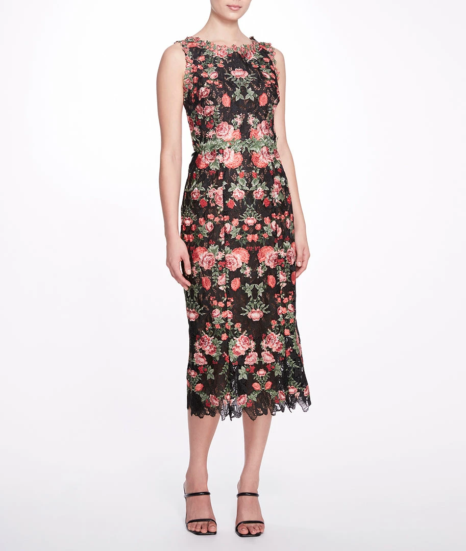 Sleeveless embroidered tulle gown guipure tea-length gown with floral trims