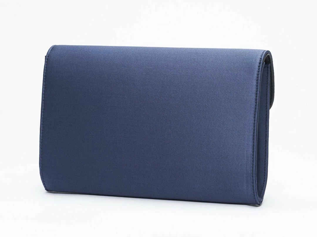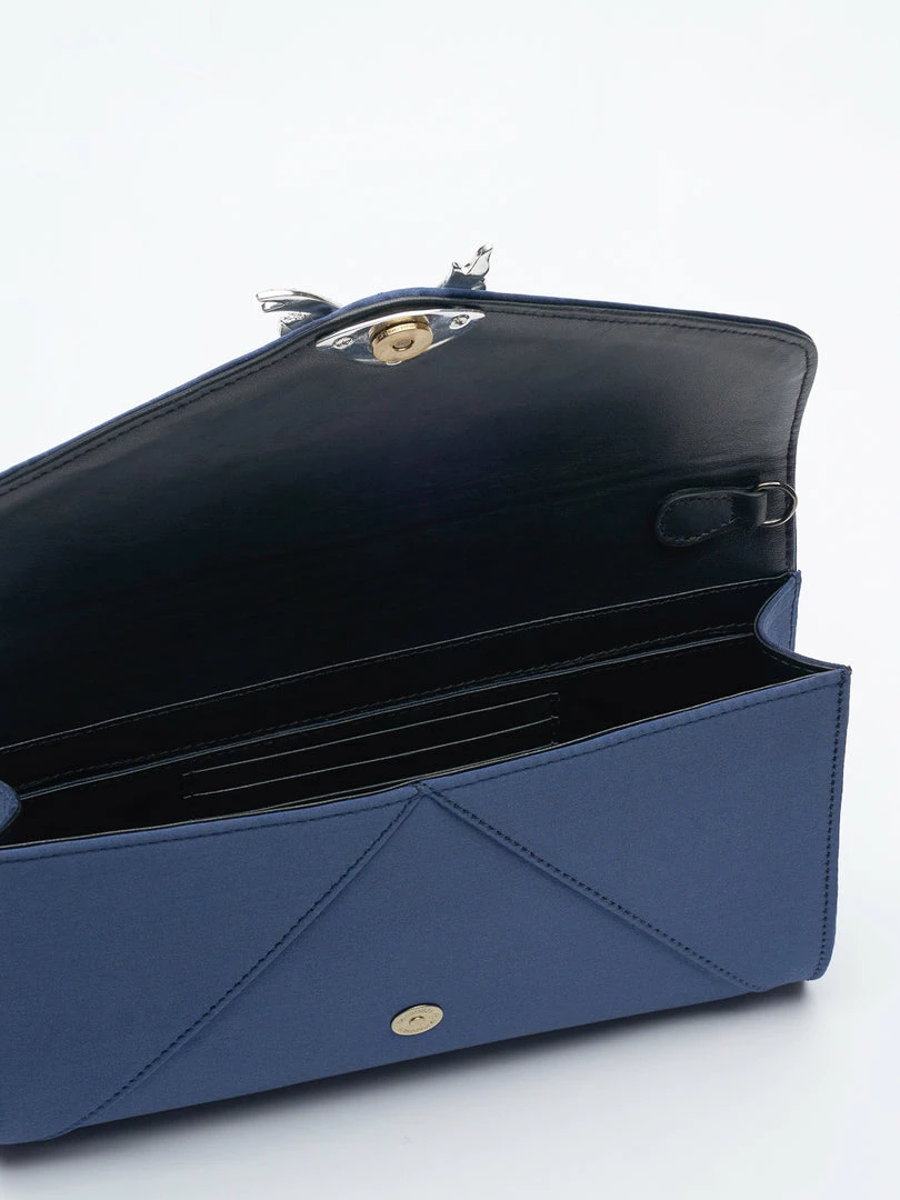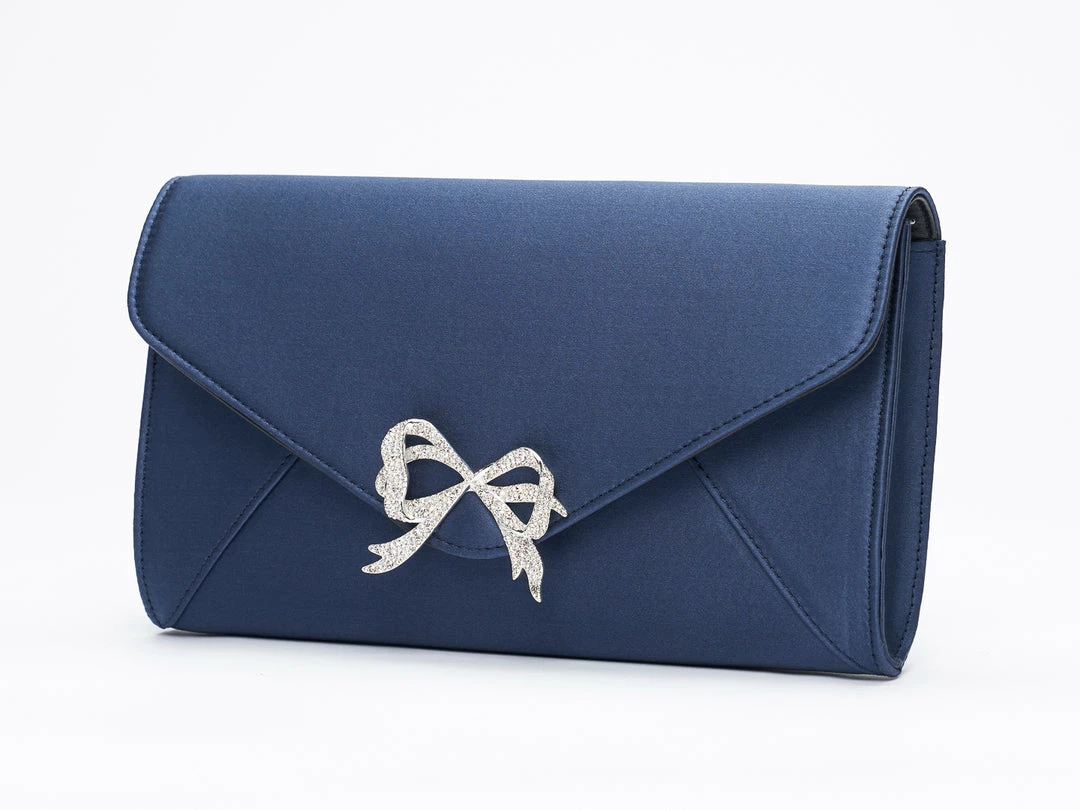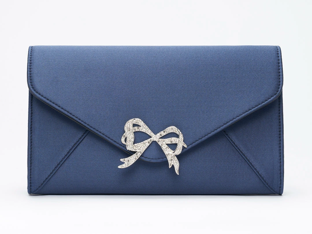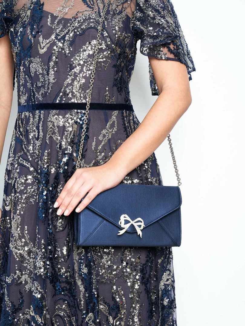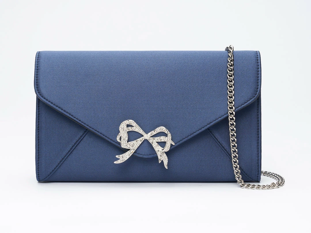 Crossbody clutch bag in cobalt blue embossed stripe satin with a removable chain and a crystal bow detail.