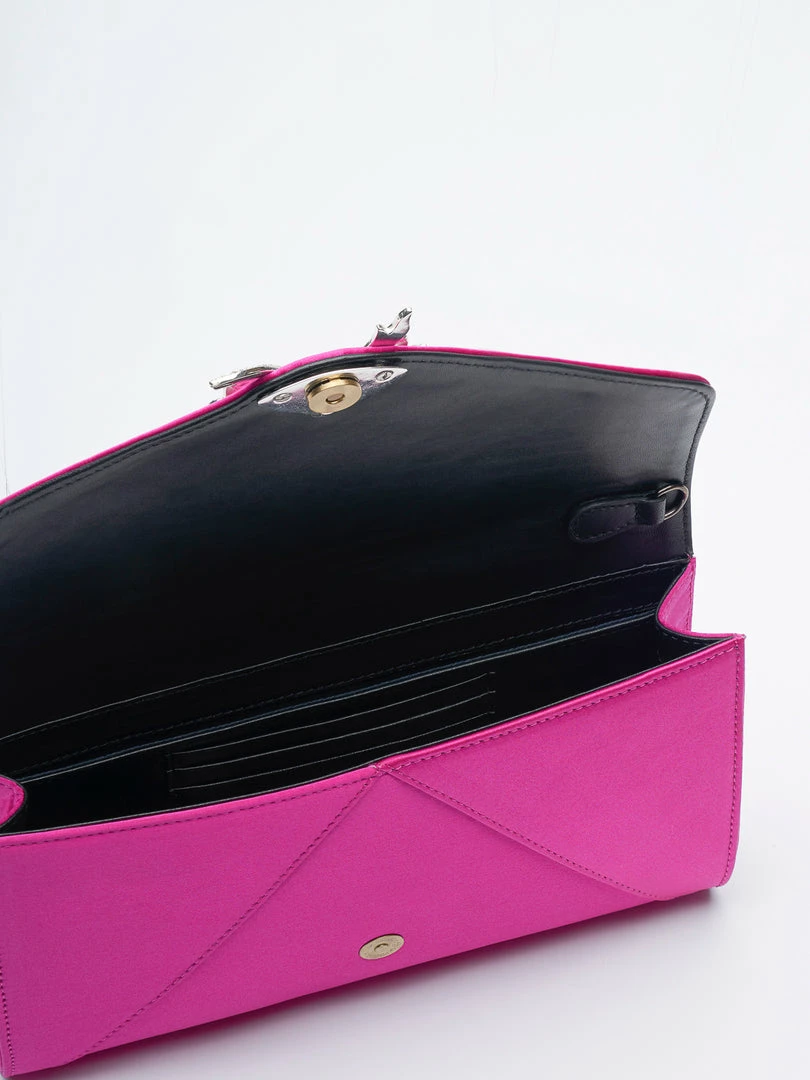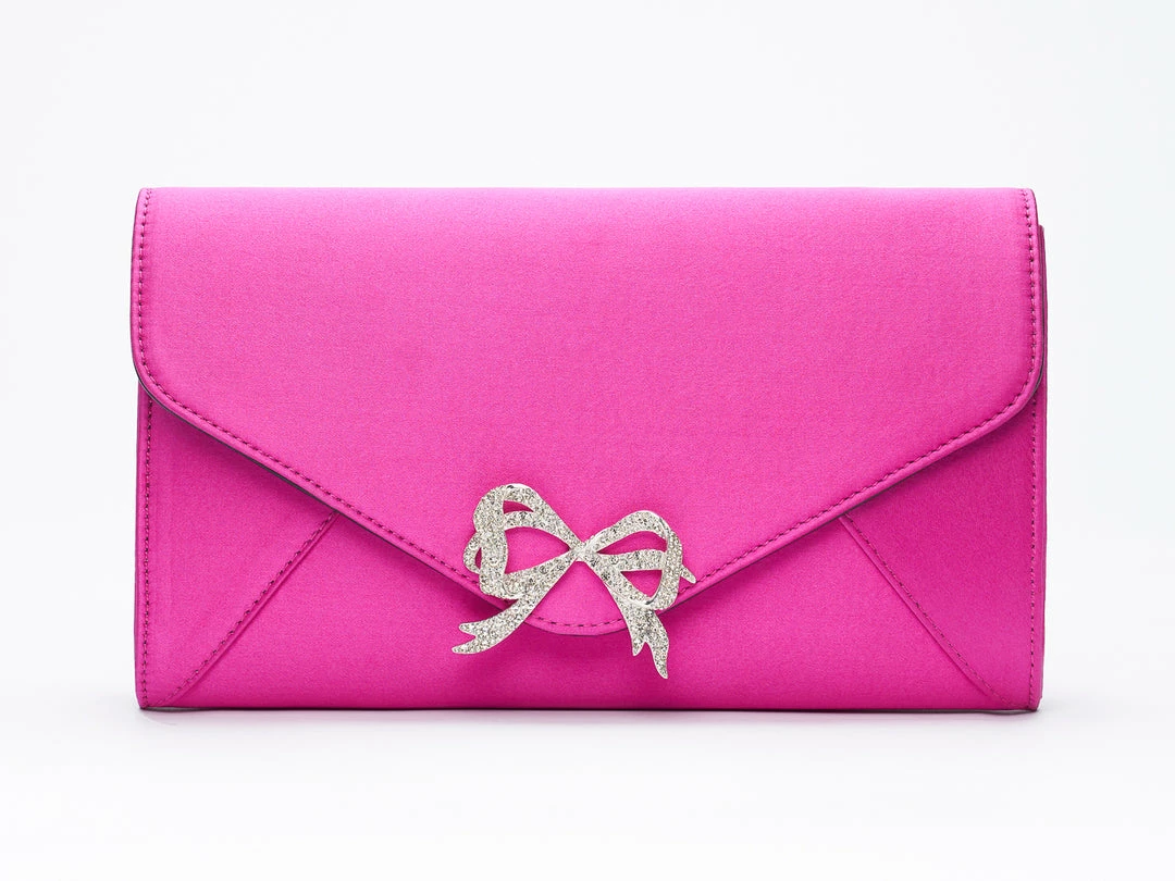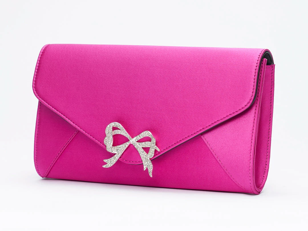 Crossbody clutch bag in fuchsia satin with a removable chain and a crystal bow detail.