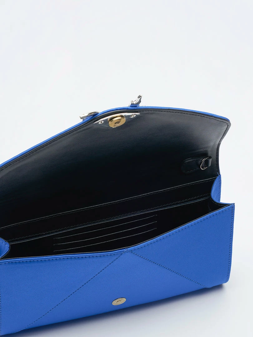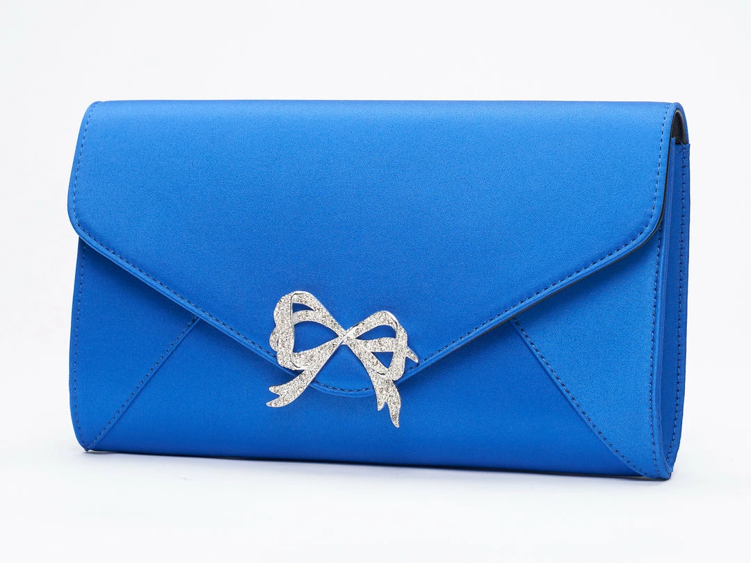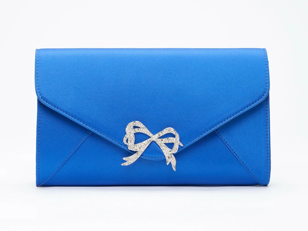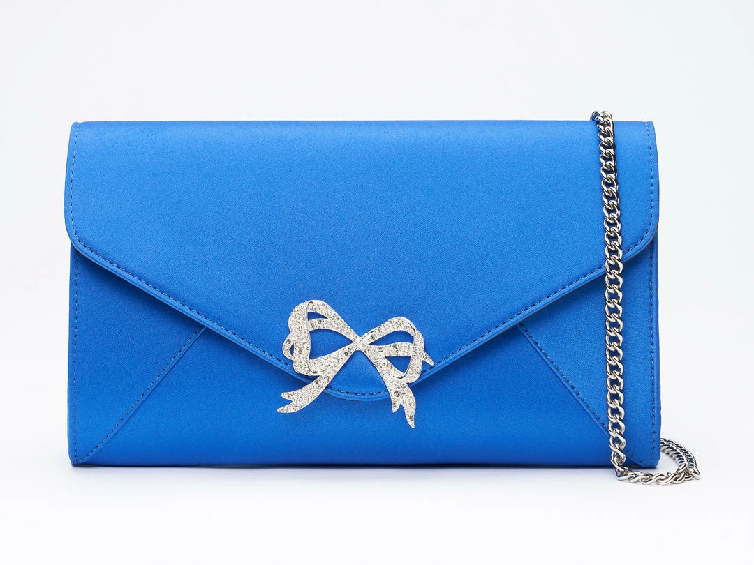 Crossbody clutch bag in marine satin embossed stripe satin with a removable chain and a crystal bow detail.
