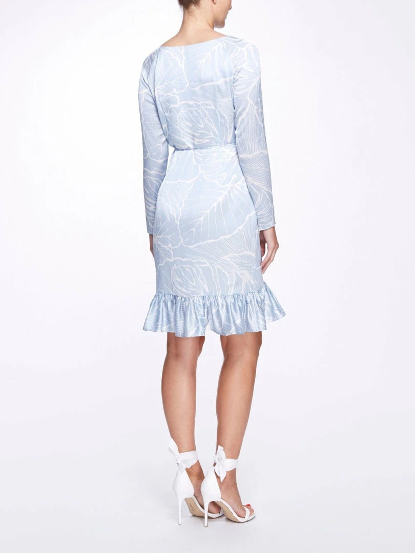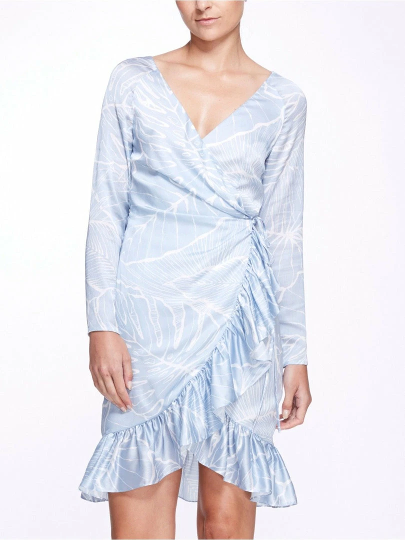 Capture picturesque blooms in the Long Sleeve Wrap Dress. Featuring a dainty ruffle hem and textured charmeuse.