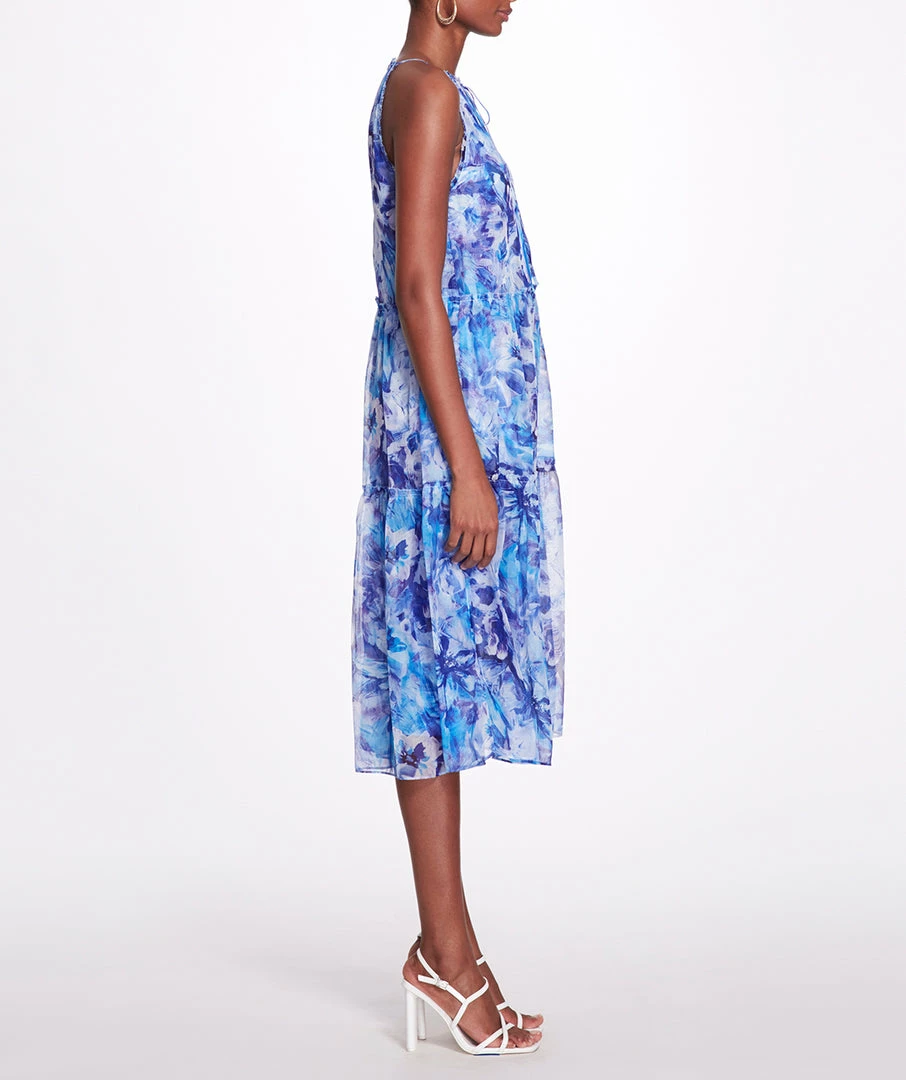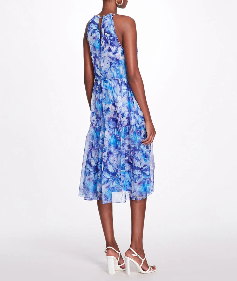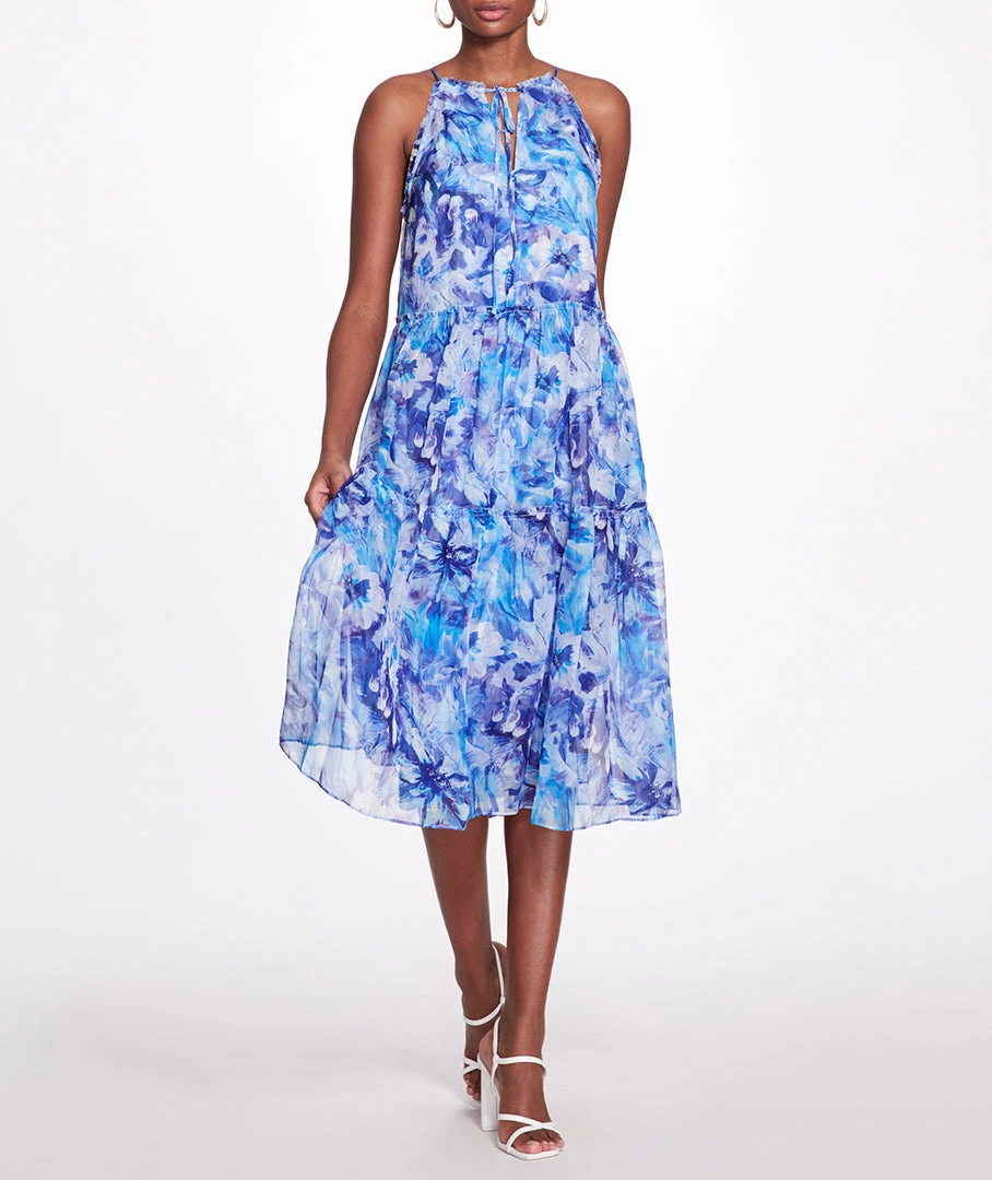 Abstract floral printed chiffon midi tiered halter tent dress with self-ruffle detail, center front keyhole with side seam pockets