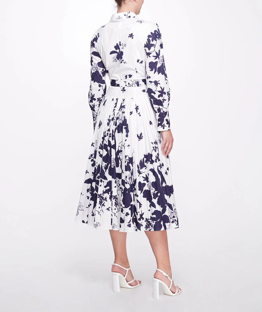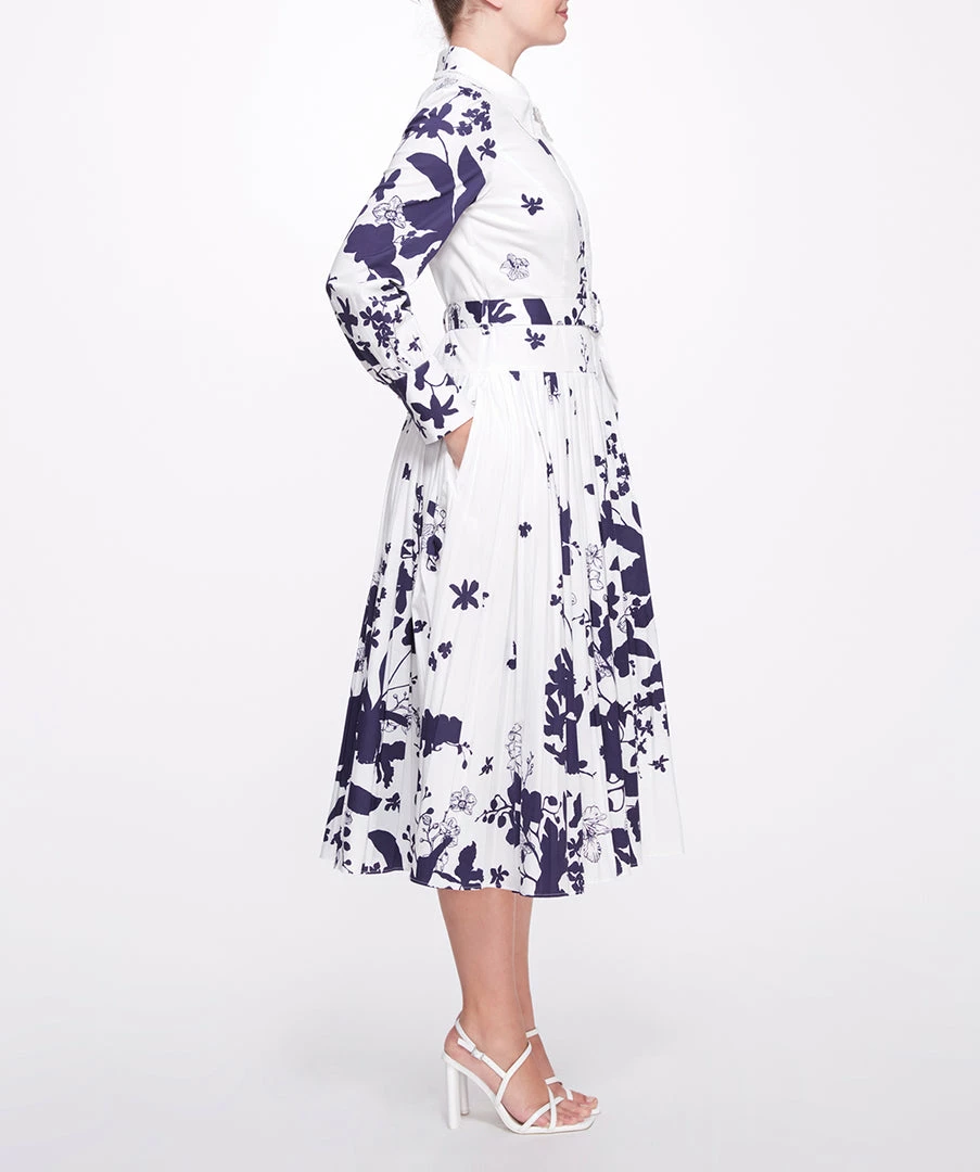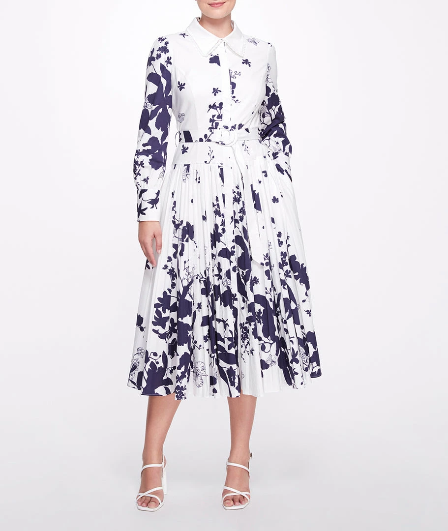 Graphic degrade printed cotton poplin long sleeve midi shirtdress with pleated skirt, self belt and trim on collar