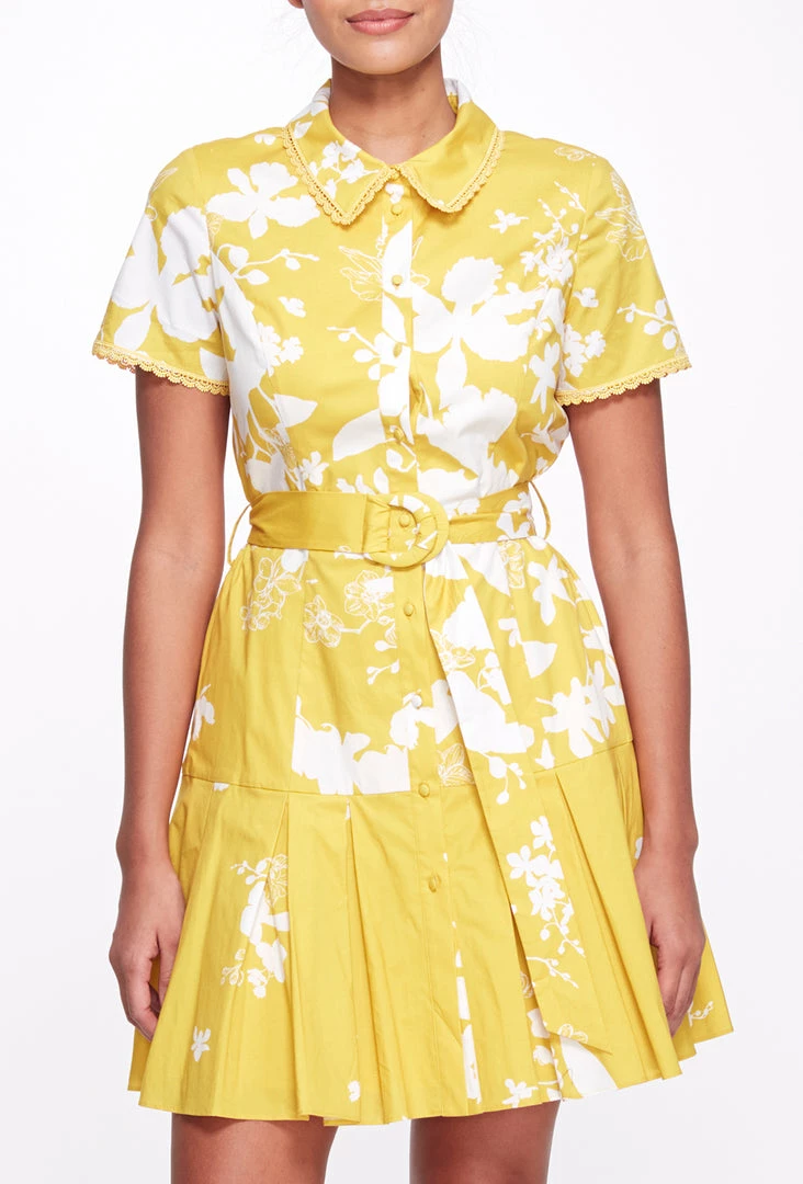 Graphic degrade printed cotton poplin short sleeve mini shirtdress with pleated flounce and self belt