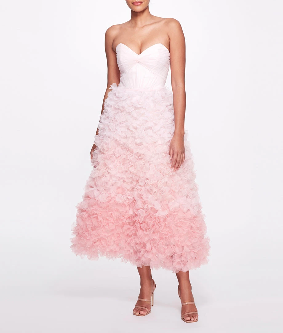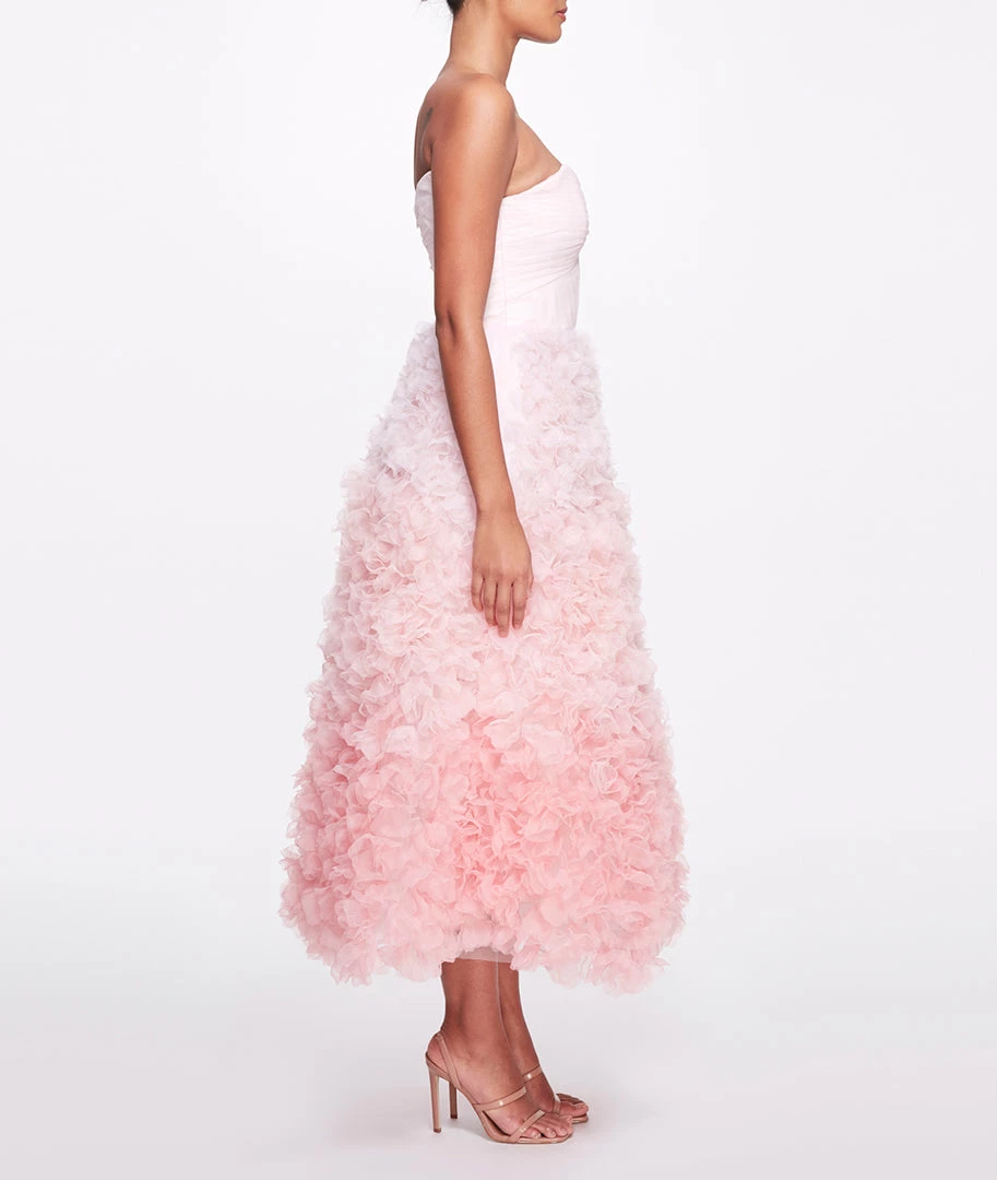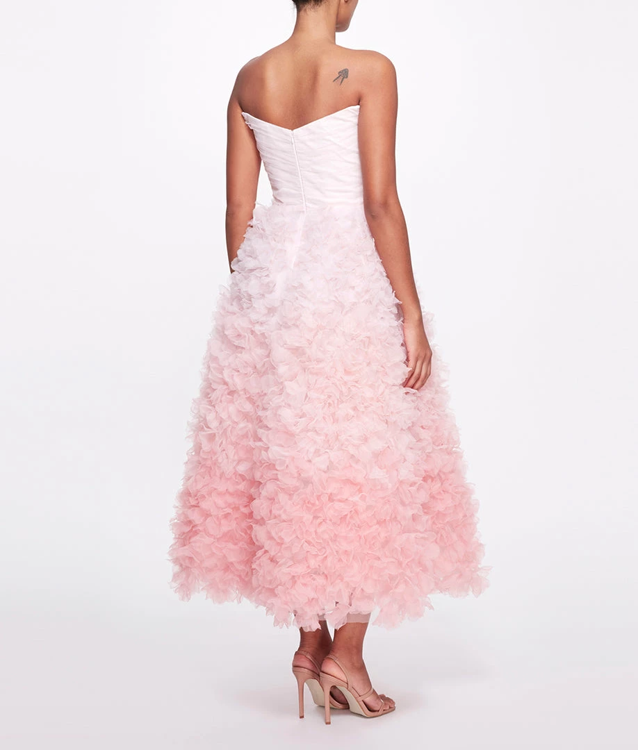 Strapless ombré textured tulle tea-length gown with draped bodice