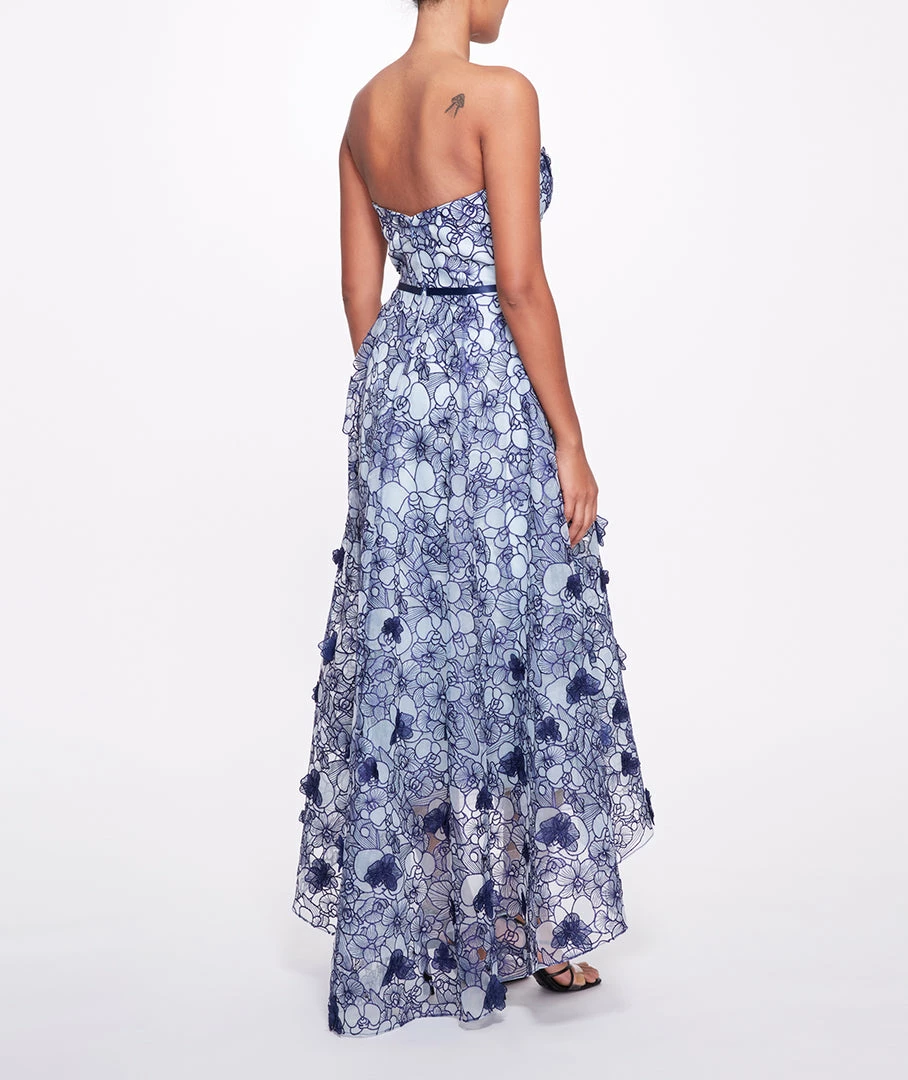 Strapless embroidered cut-out organza gown with 3D appliqués