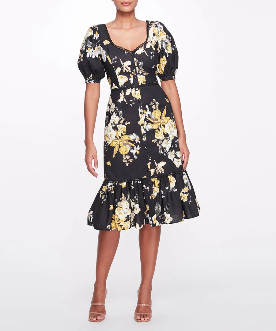 Exuberant floral print cotton poplin short puff sleeve fitted midi dress with ruffle hem and sweetheart neckline