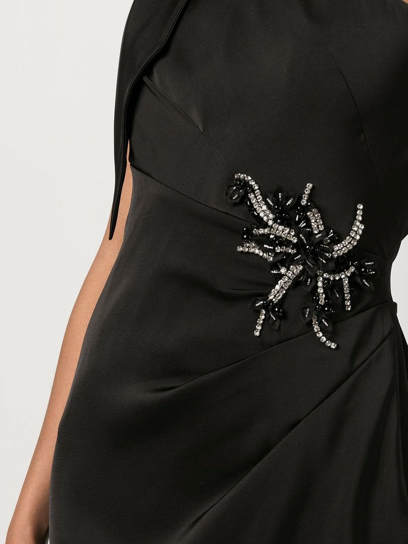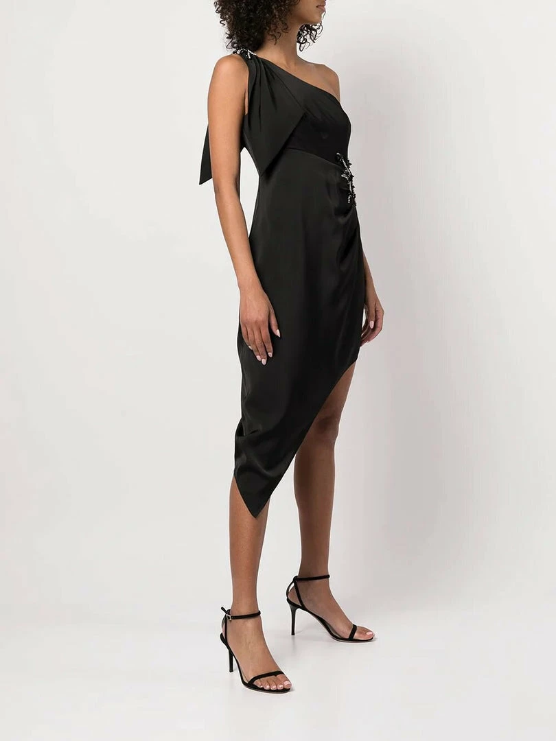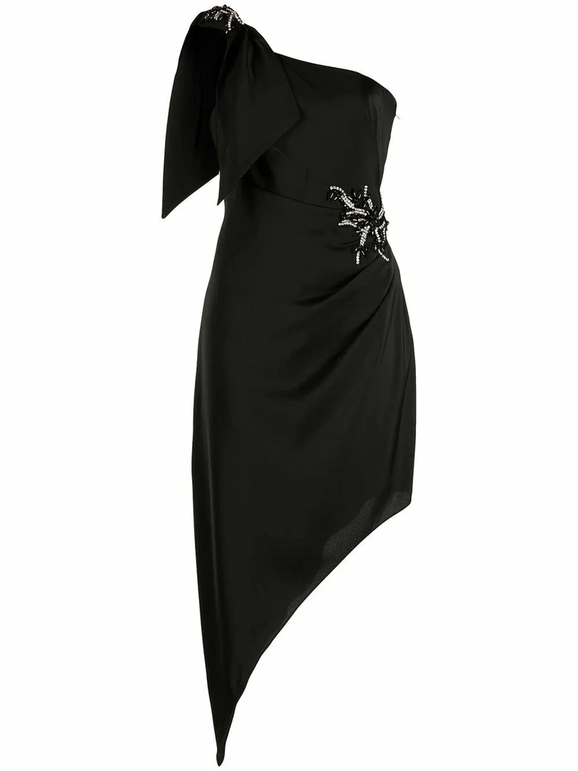 Black one shoulder satin crepe cocktail with beaded flower detail and asymmetrical hem.