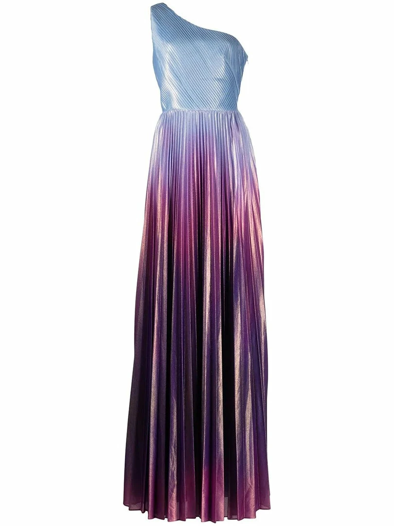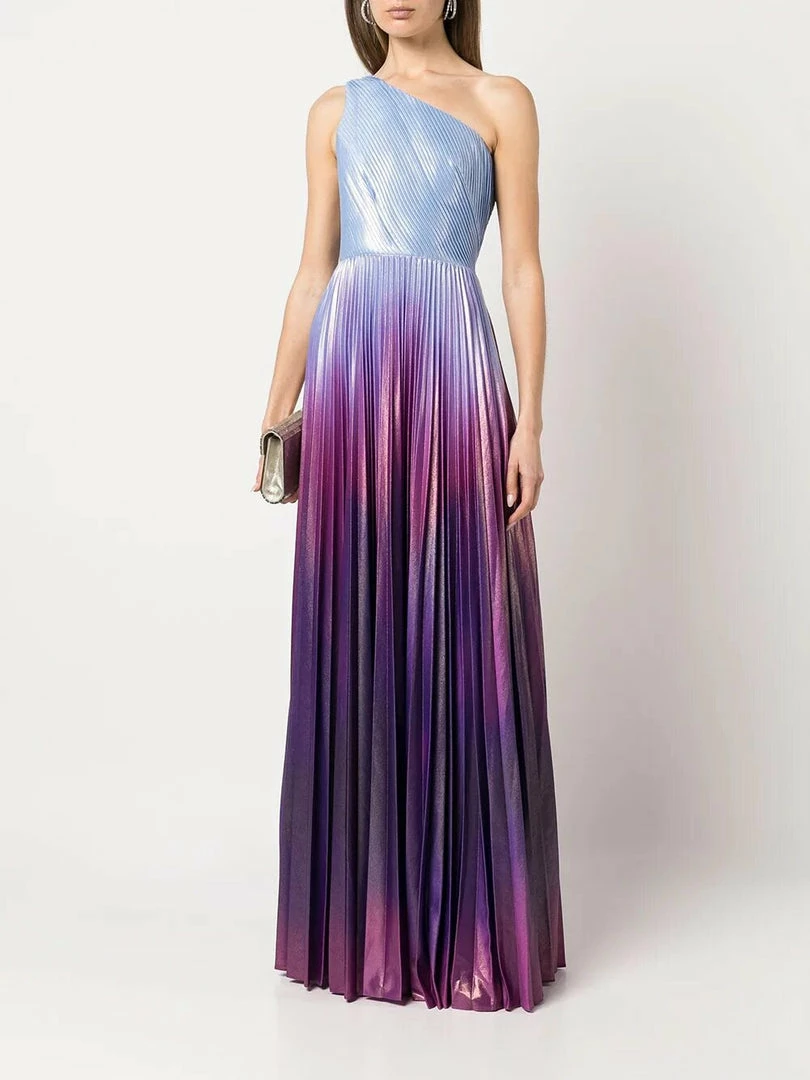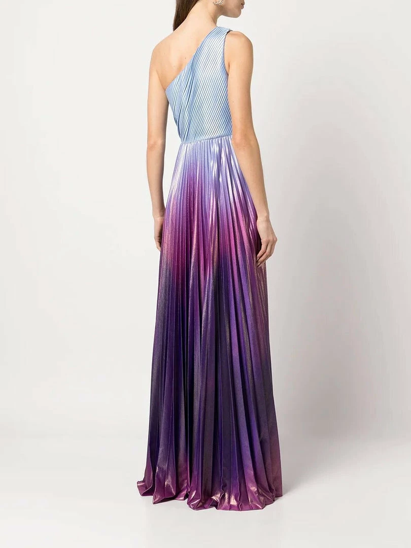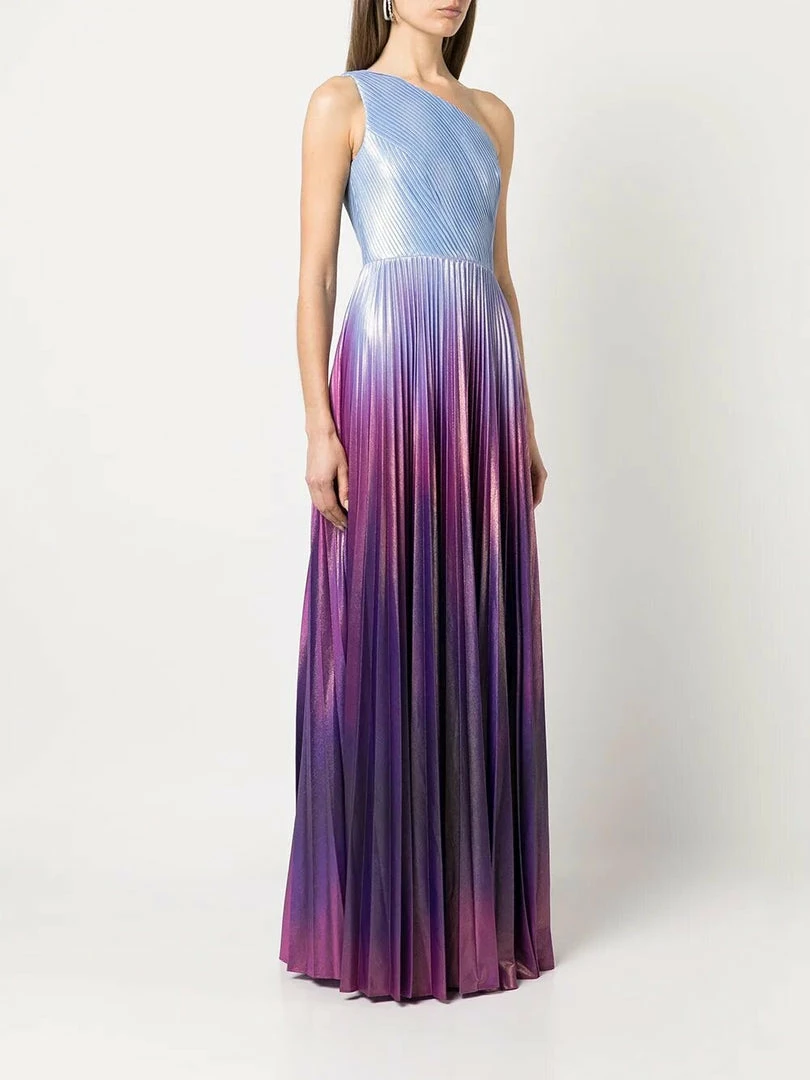 One shoulder pleated radiating ombre lamé gown with front leg slit.
