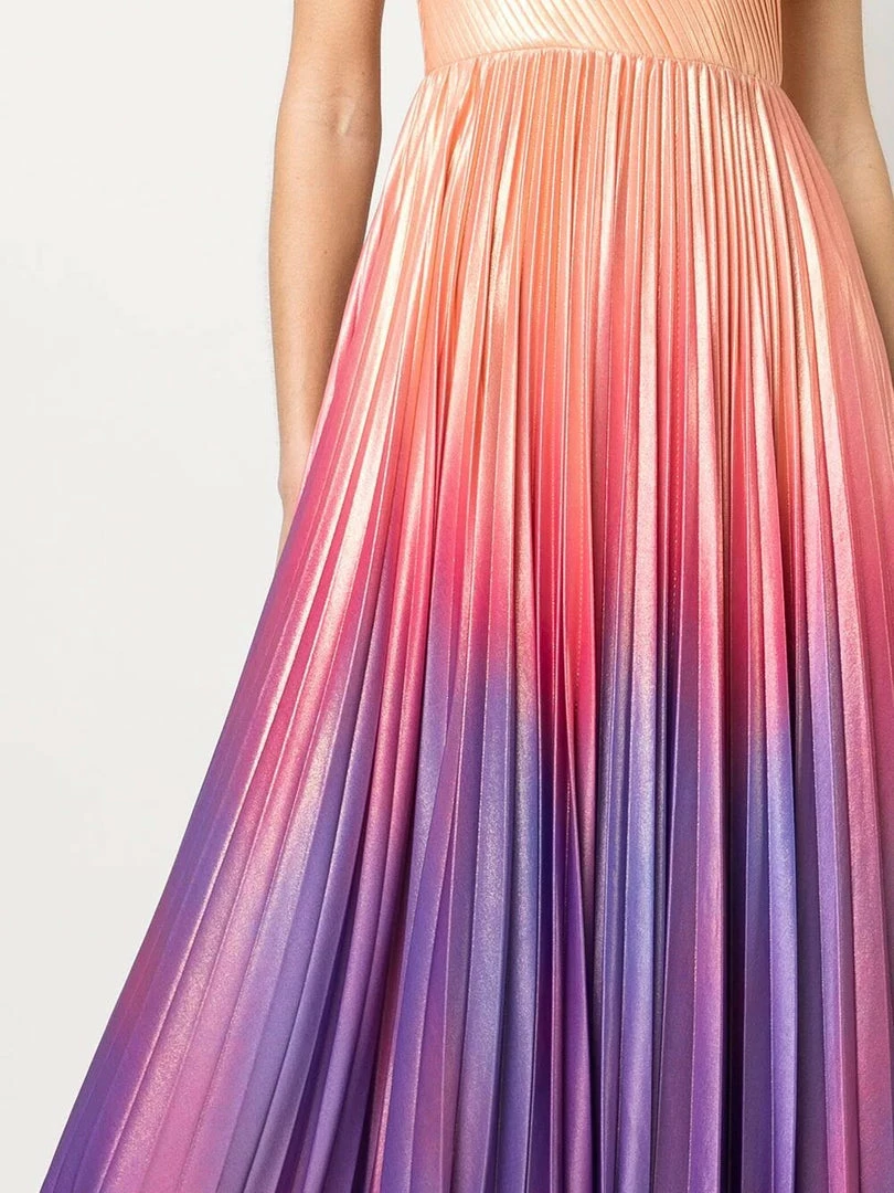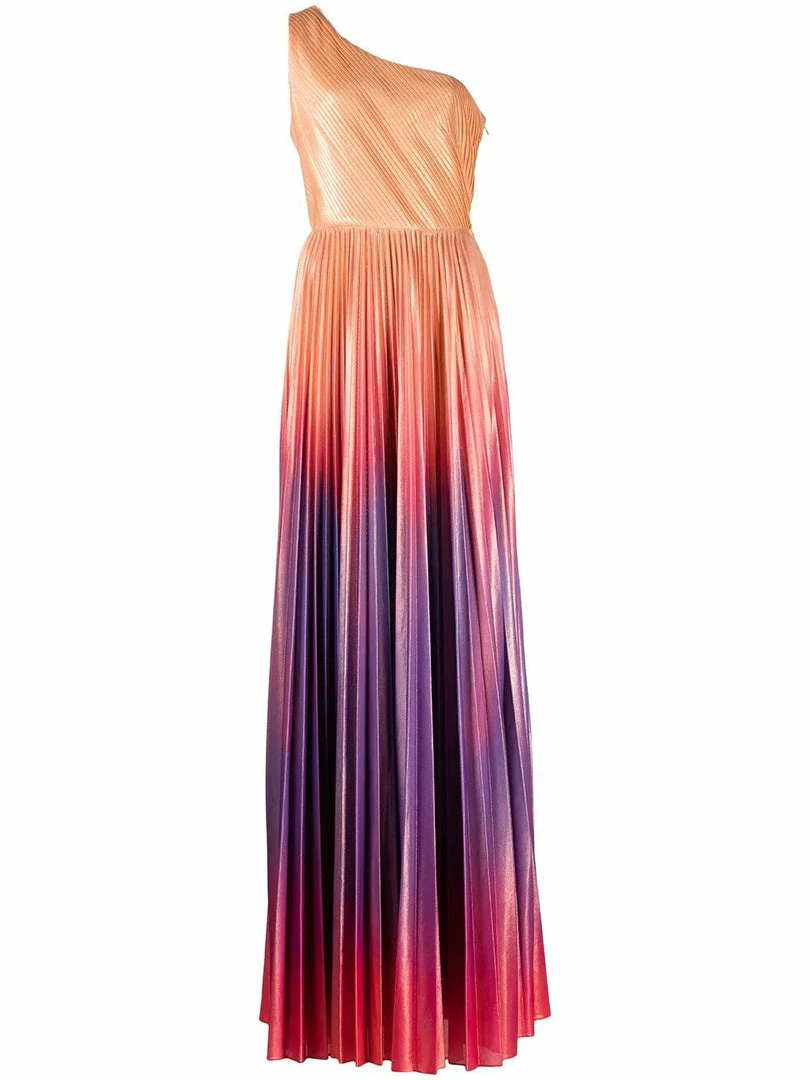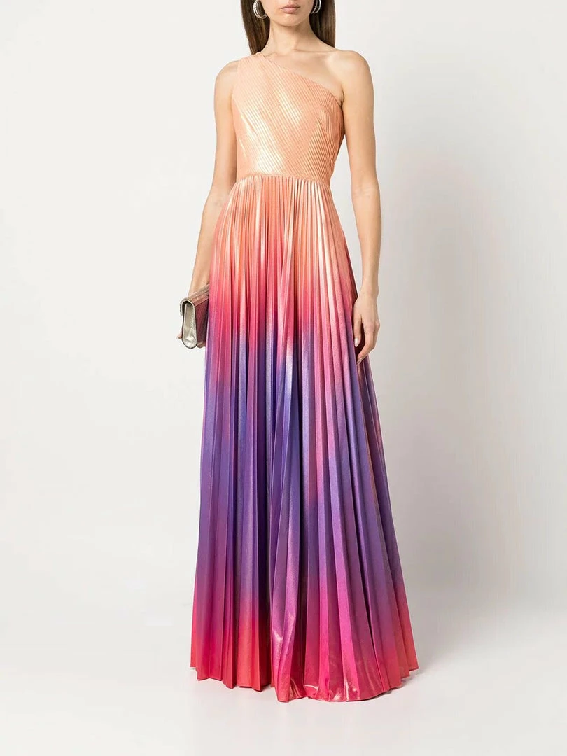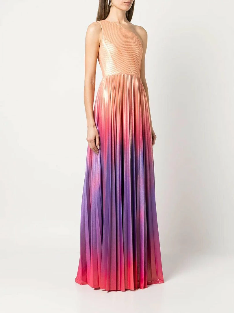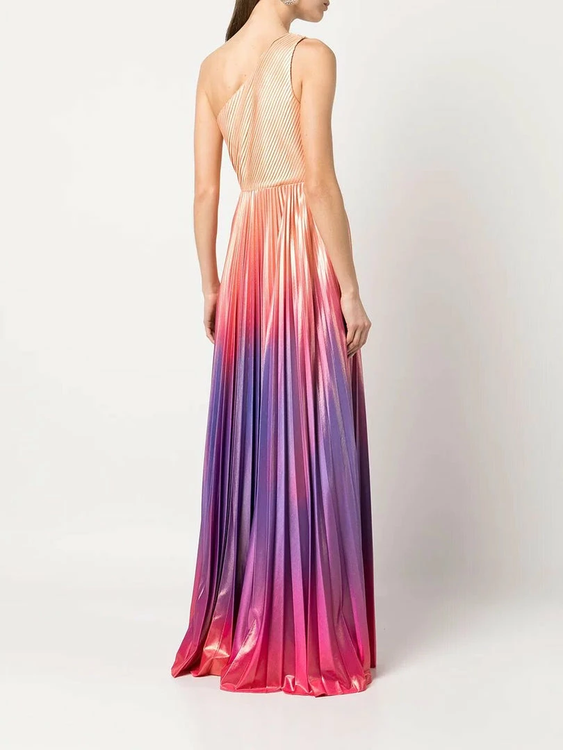 One shoulder pleated radiating ombre lame gown with front leg slit.