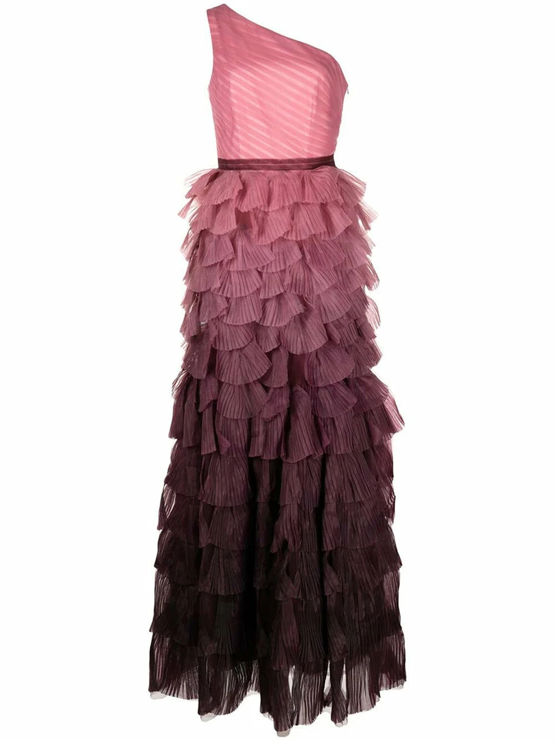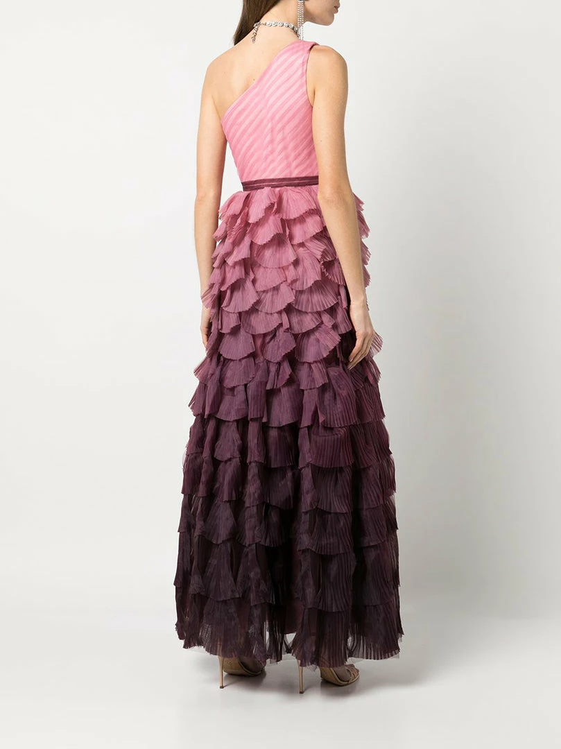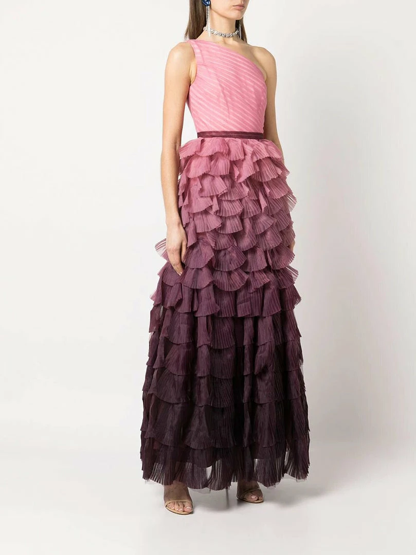 Rose one shoulder ruffled gown featuring a tiered ombre bodice and fitted waist.
