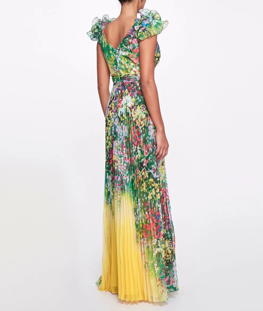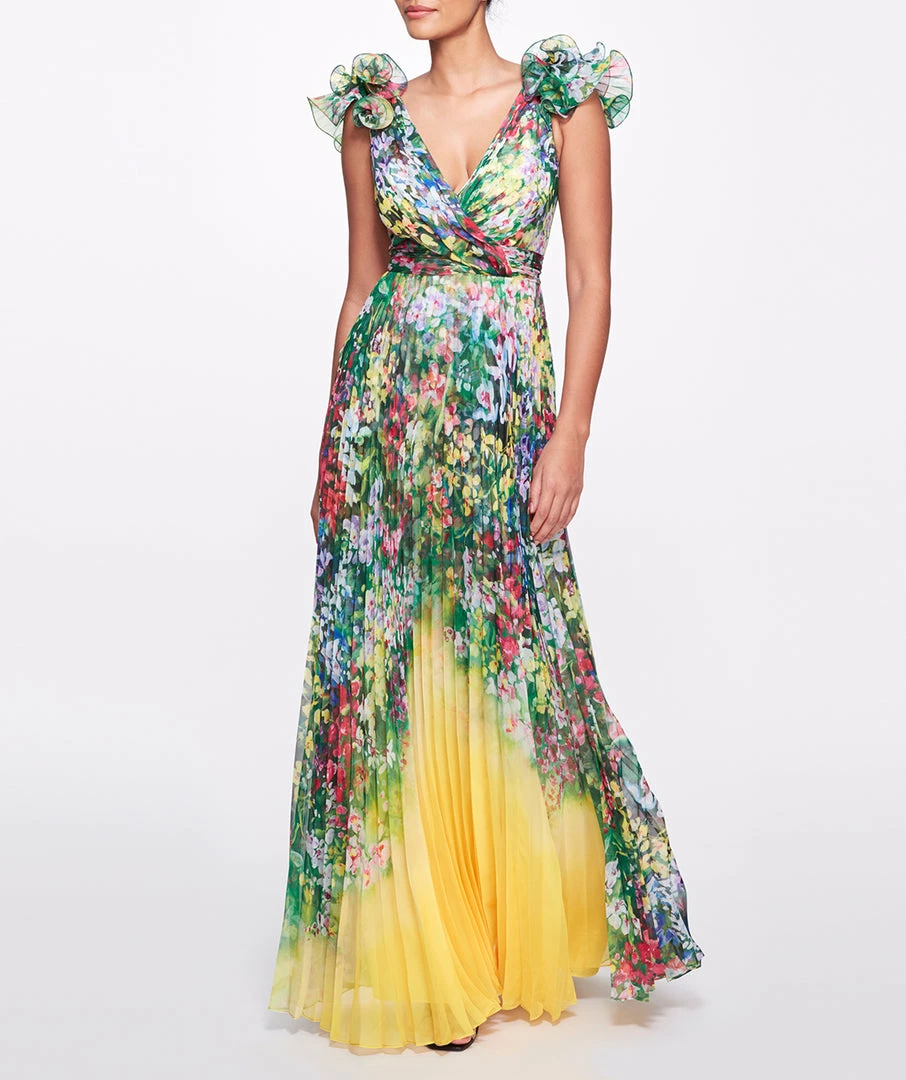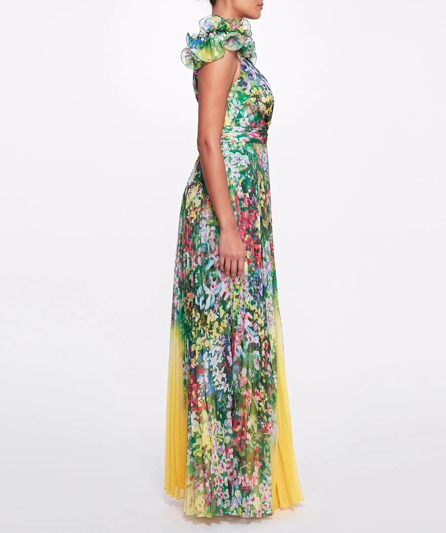 Sleeveless printed pleated chiffon gown with ruffle detail