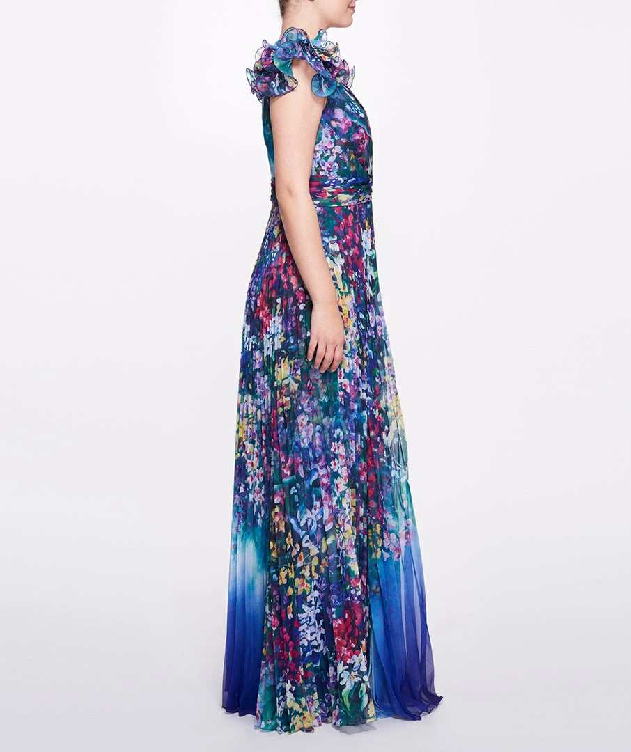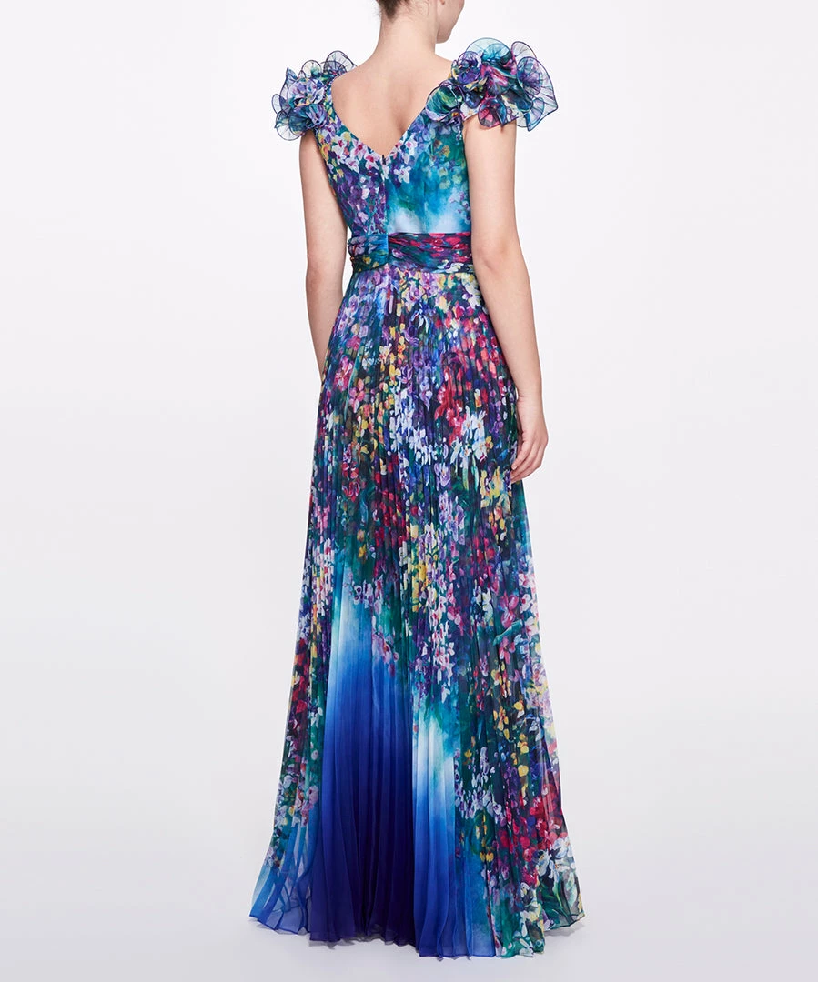 Sleeveless printed pleated chiffon gown with ruffle detail