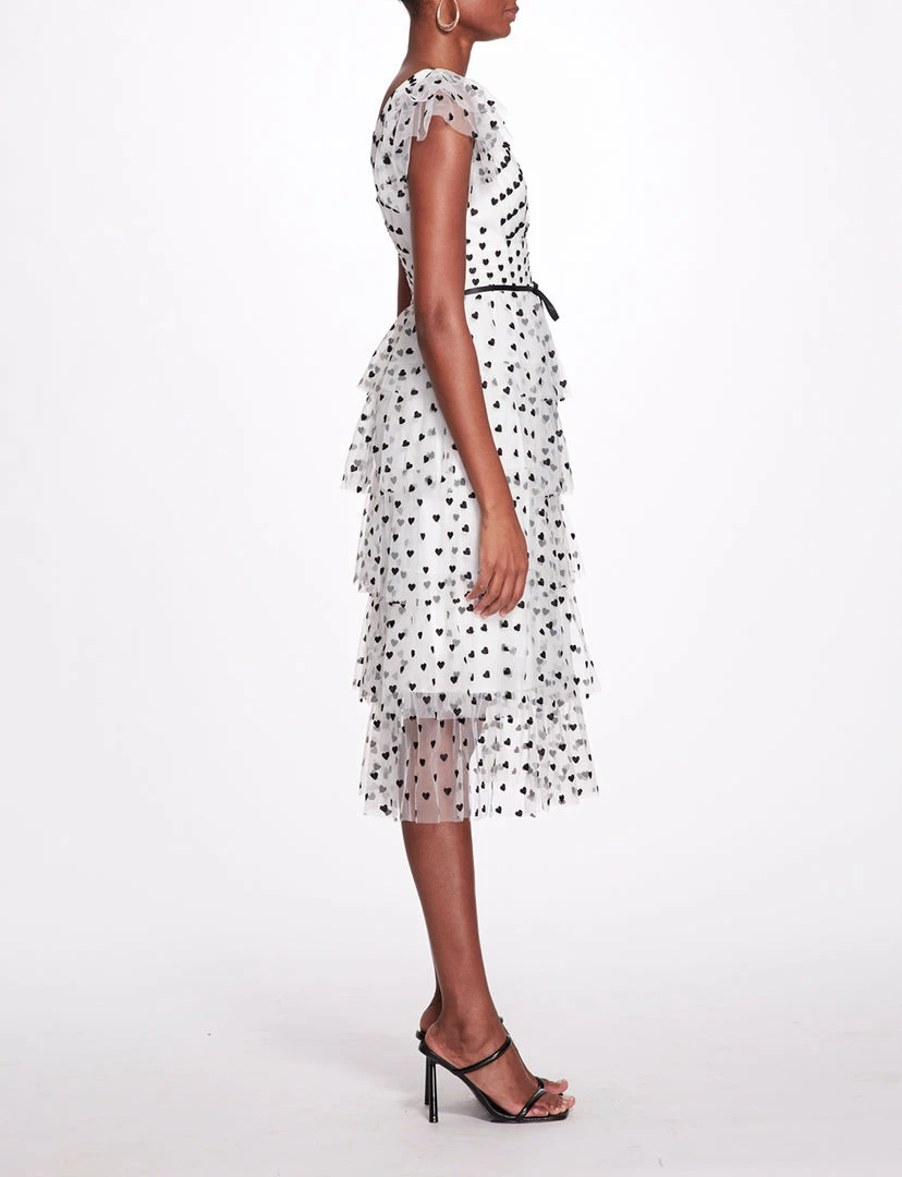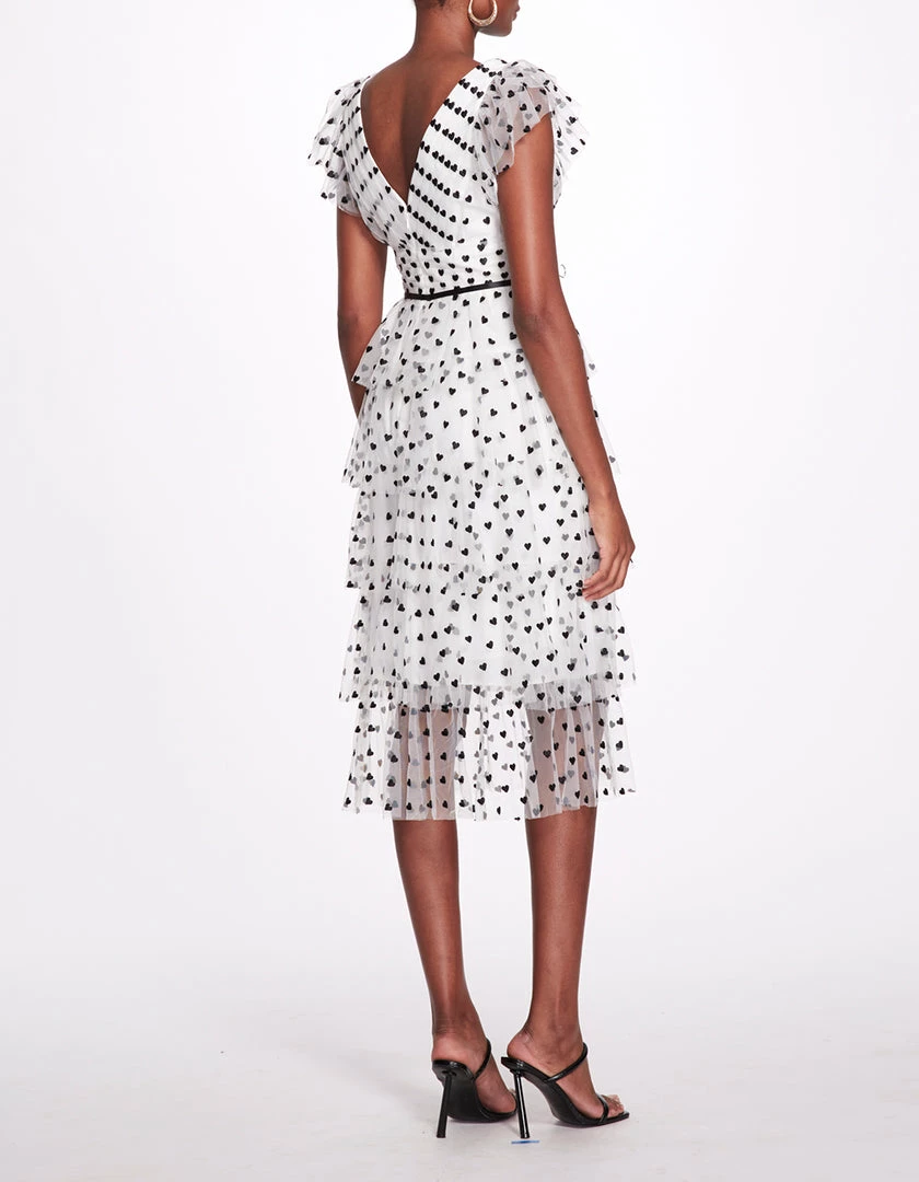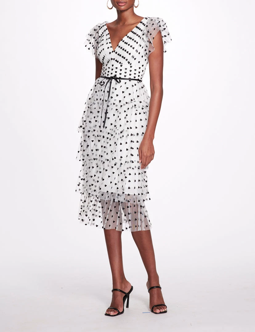 Printed tulle 5-tier v-neck cocktail with draped bodice and waistband